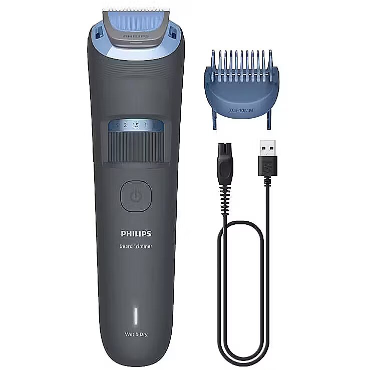 Specifications• Series: Philips 3000• Length range: 0.5–10 mm• Length settings: 20• Adjustment step: 0.5 mm• Lift & Trim comb system• Blades: self-sharpening, rounded tips• Washable: fully washable• Runtime: up to 60 minutes• Charging time: approx. 4 hours• Power: Li-Ion battery• Charging indicator: yes• Colour: dark grey• Included: trimmer, adjustable comb, cleaning brush, USB-A cable