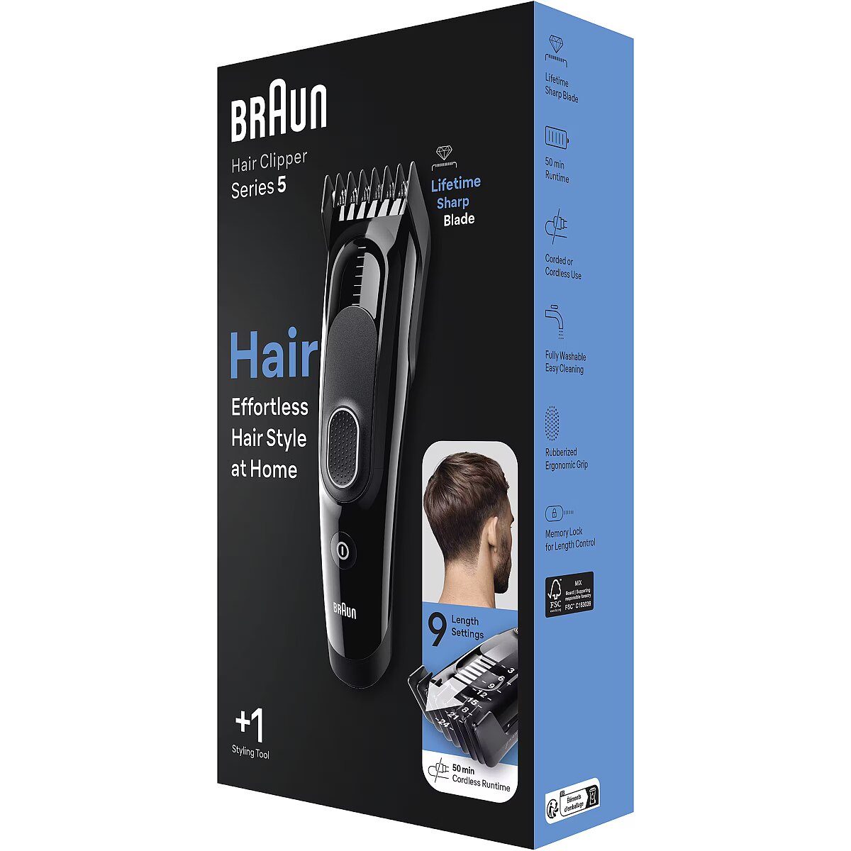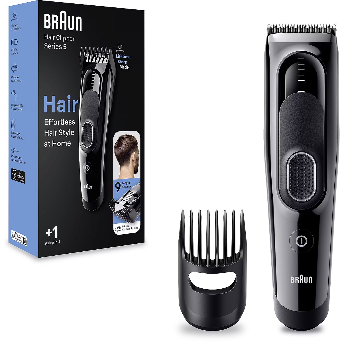 LongSummaryDescription - Braun Hairclipper 5 HC5310. Product colour: Black, Minimum hair length: 3 mm, Maximum hair length: 2.4 cm. Power source: Battery, Operating time: 50 min, Battery type: Built-in battery. Country of origin: China. Width: 137 mm, Depth: 57 mm, Height: 282 mm. Package width: 275 mm, Package depth: 190 mm, Package height: 113 mm
