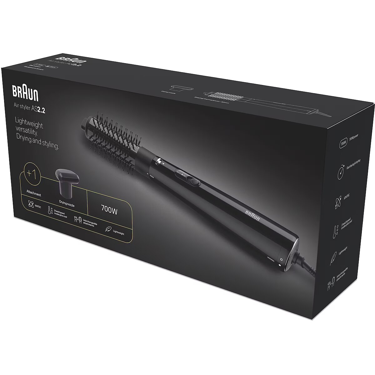 LongSummaryDescription - Braun AS2.2. Control type: Scrollbar, Suitable for hair types: Frizzy hair. Product colour: Black. Cord length: 1.95 m. Power: 300 W, Power source: AC. Brush diameter (max): 4 cm