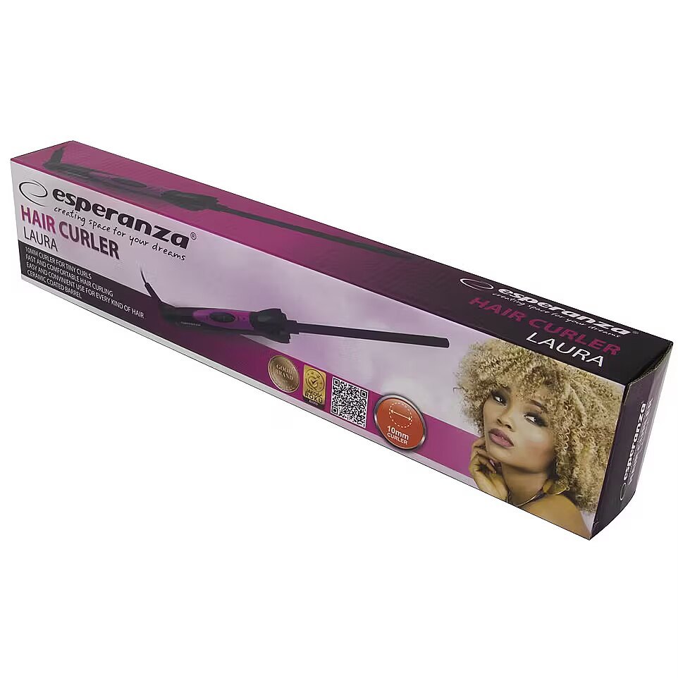 LargeDescHTML - Esperanza hair curler LAURA is perfect for hair styling and essential for every woman who cares about her looks. It lets her quickly create  superb hairstyle for each and every occasion.The hair curler has a ceramic-coated roller with its diameter of 10mm to let you form tiny spiral curls. It will work perfectly to do even the toughest hair styles.