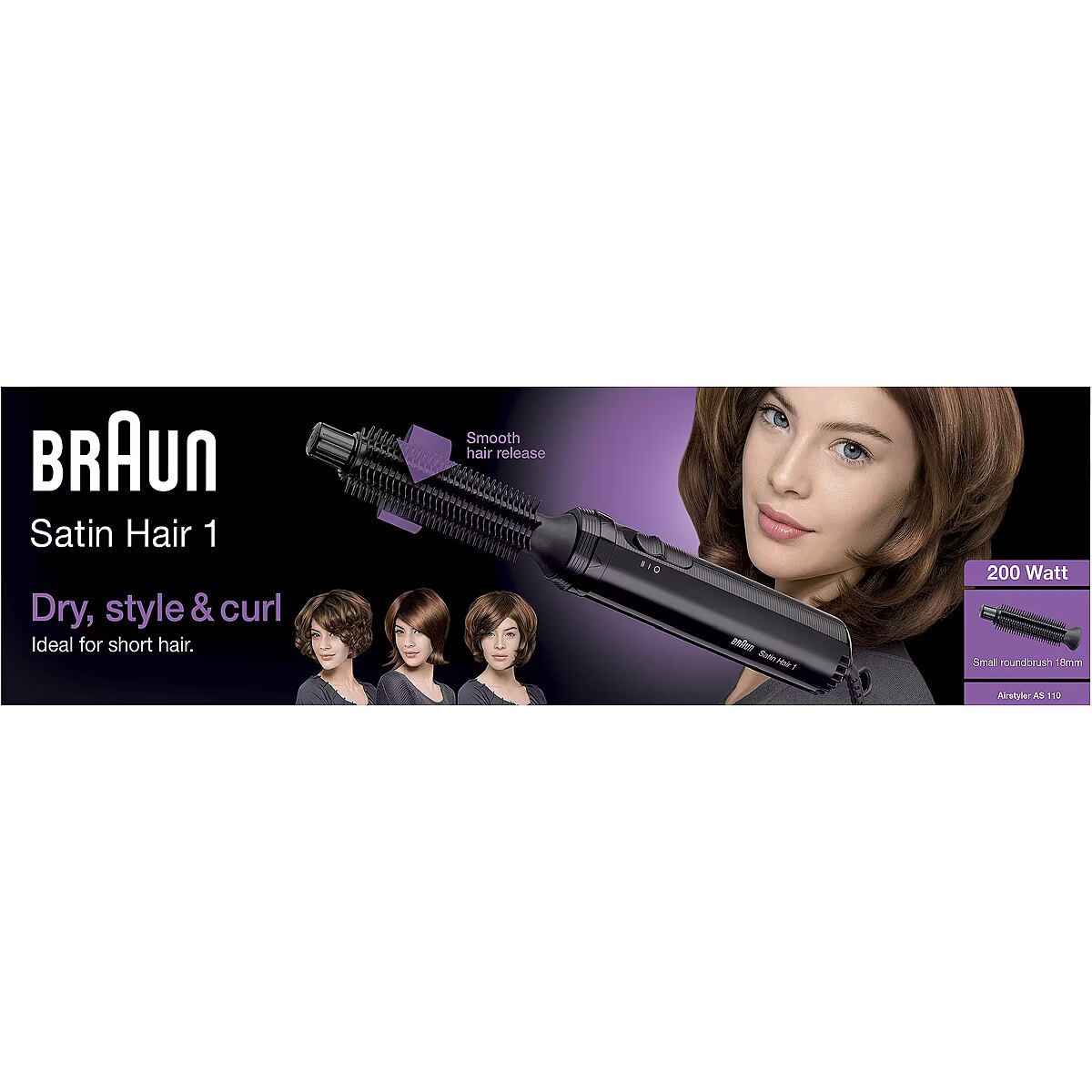 LongSummaryDescription - Braun Satin Hair 1 AS110. Type: Hot air brush, Technology: Warm, Control type: Scrollbar. Product colour: Black. Cord length: 2 m. Power: 200 W, Power source: AC. Cable colour: Black