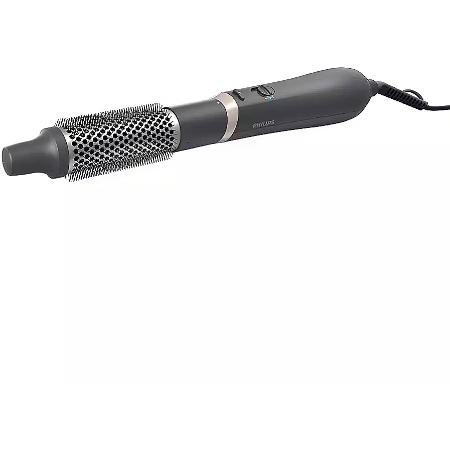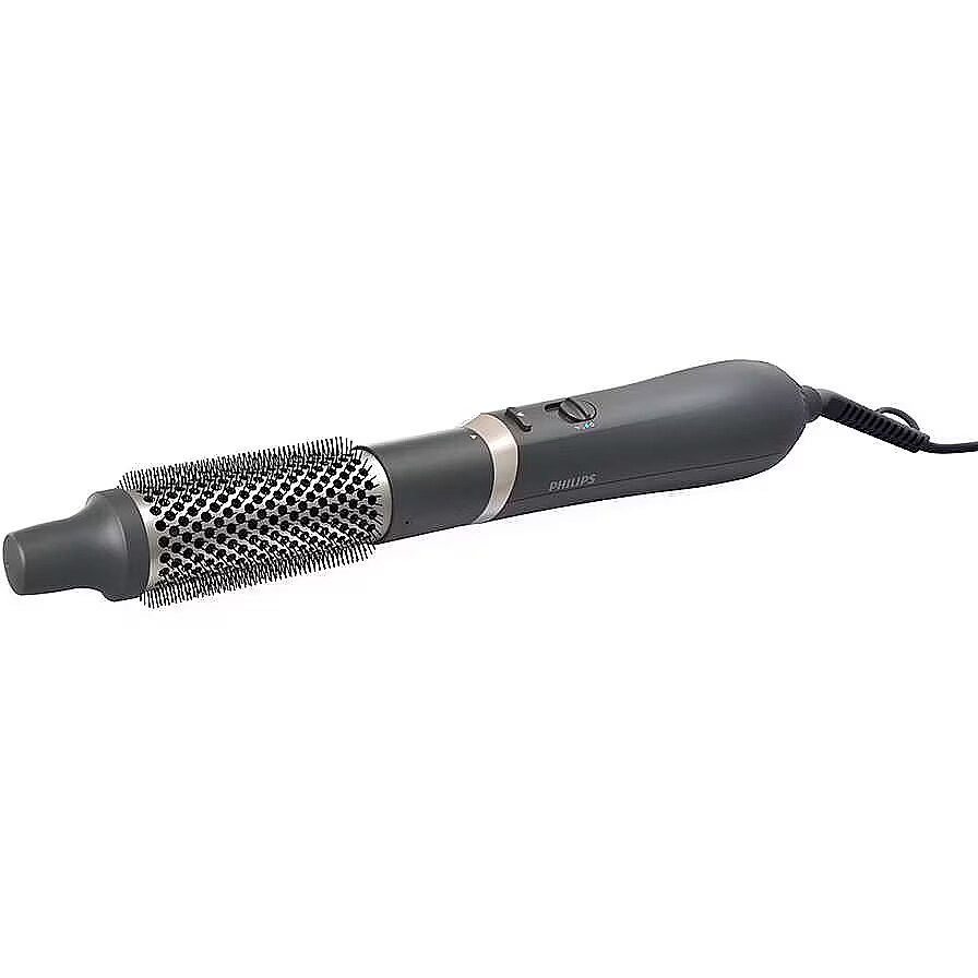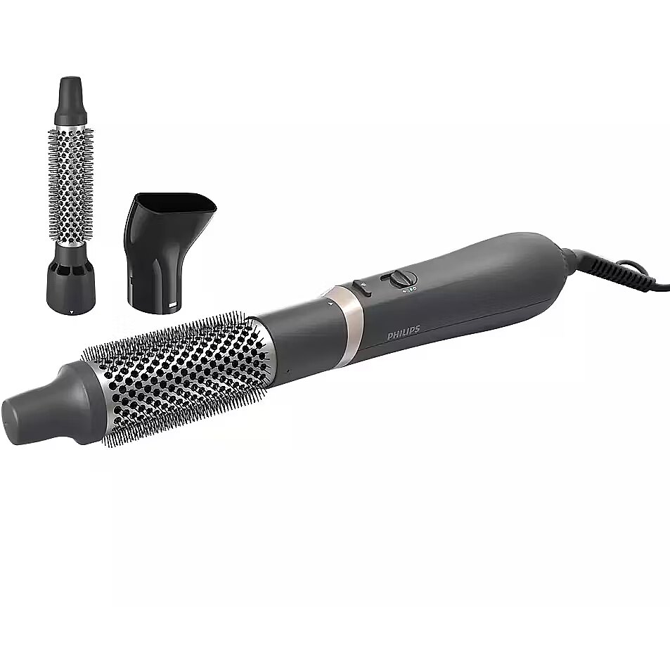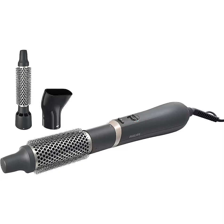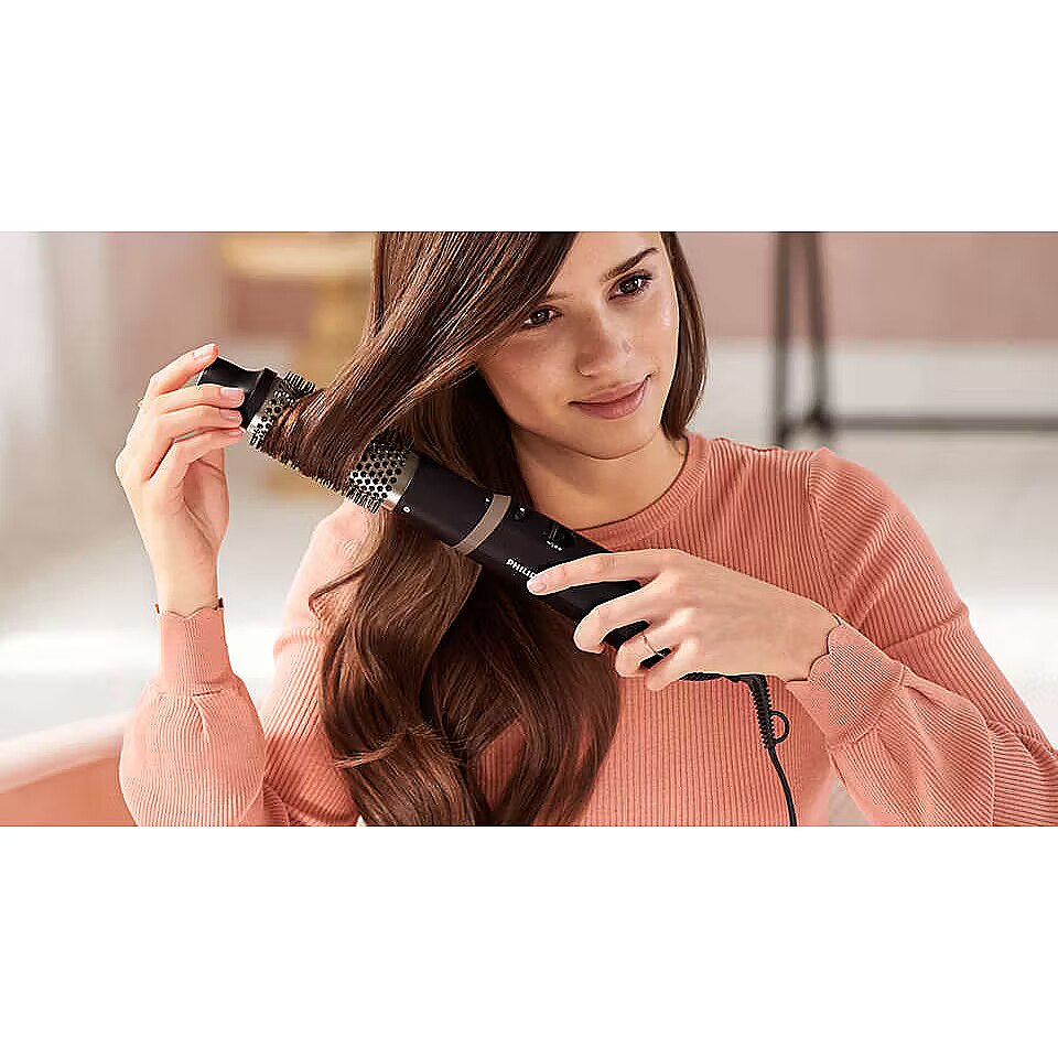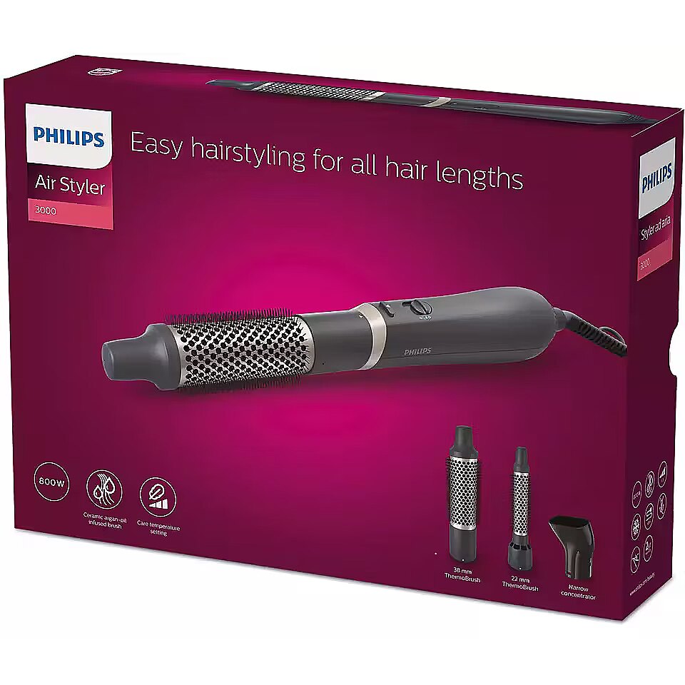 Description - Easy styling for all hair lengths Drying and styling at the same time, the Philips Air Styler Essential curling iron allows you to create beautiful, natural hairstyles and provides hair care. The 3 attachments are suitable for long and short hair, making styling super easy. Comfortable use Cool air setting for gentle drying Perfectly styled hair Three adjustable heat and speed settings provide simplified control 800 watts of power for beautiful styling results 38mm diameter thermal brush for smooth hairstyles and waves Narrow concentrator ensures intensive airflow 22mm diameter thermal brush for easy curls Care and protect Care setting for enhanced protection during drying and styling Brush with argan oil