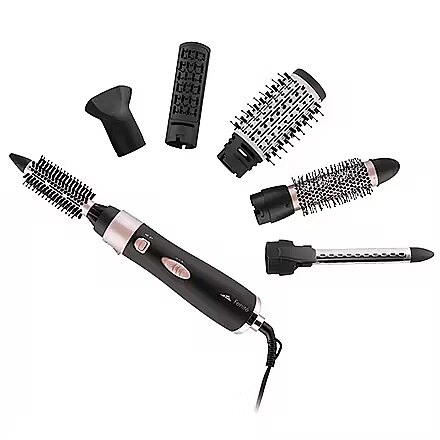 Packaging content > Hair care accessories - Round brush 21 mm; Round brush 50 mm; Wavy attachment with a diameter of 33 mm; Curling iron with tongs; Flat brush; Concentrator