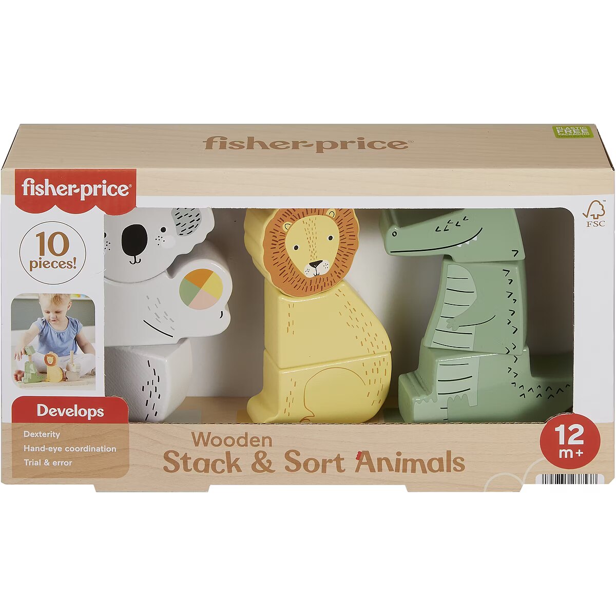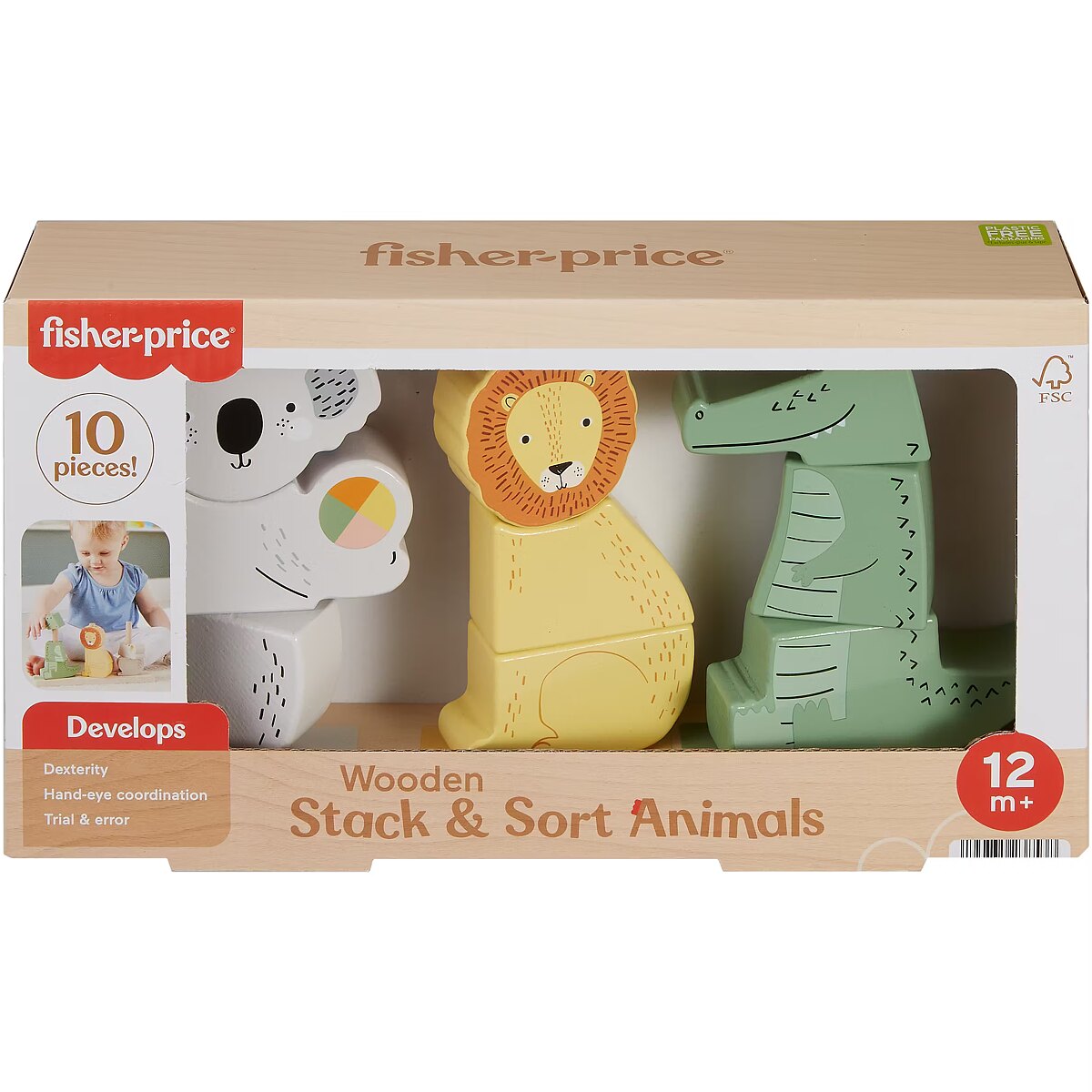 Description - Fisher-Price Drewniane Zwierzątka "Układaj i Sortuj" Pomóż rozwijać wyobraźnię dziecka z zabawką zręcznościową Drewniane zwierzątka "Układaj i sortuj" od Fisher-Price! Maluchy mogą układać elementy zestawu na specjalnej podstawie, aby stworzyć aligatora, lwa, koalę lub wymyślone przez siebie zwierzę. Sortowanie i układanie elementów pomaga rozwijać zręczność i umiejętność rozwiązywania problemów. Zabawka została wykonana z drewna pochodzącego z prawidłowo zarządzanych lasów z certyfikatem FSC (FSC C130462, 2022). Zabawka zwierzątka dla dzieci do sortowania i układania zachęcająca do kreatywnej zabawy. Zestaw wykonany z drewna pochodzącego z prawidłowo zarządzanych lasów z certyfikatem Forest Stewardship Council i dostarczany w opakowaniu bez plastiku (FSC C130462, 2022). Kreatywna zabawka, która pomaga rozwijać zręczność i umiejętność rozwiązywania problemów. Zawiera 1 podstawę do układania i 9 klocków. Drewniana zabawka dla rocznego dziecka, kreatywny prezent na roczek.