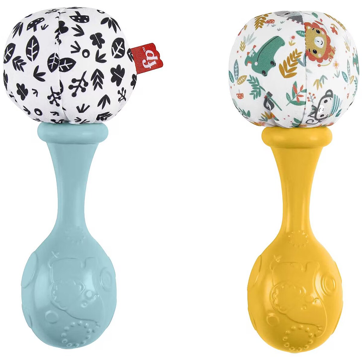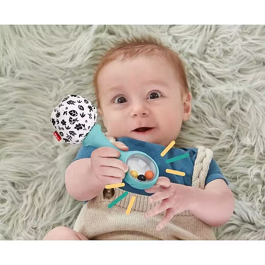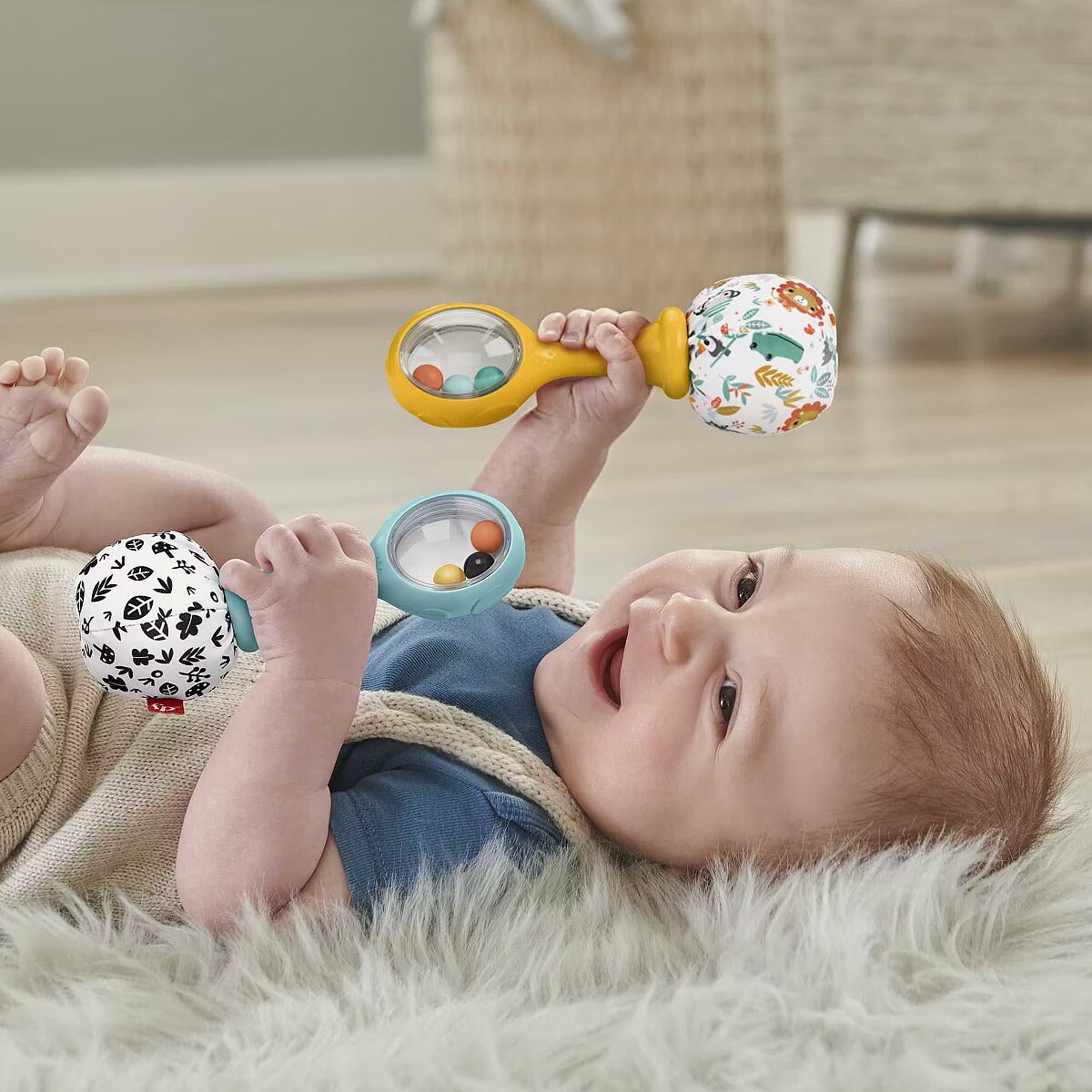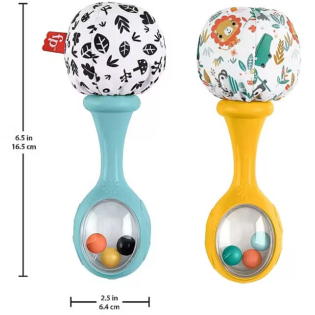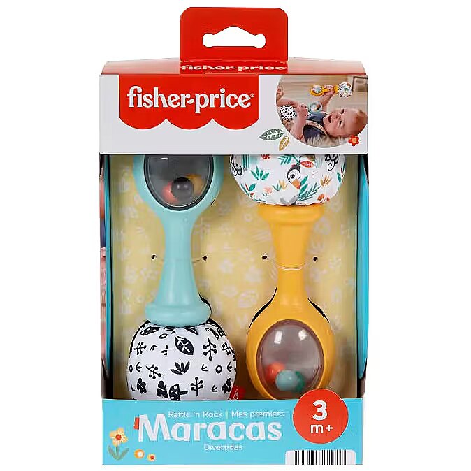Description - Fisher-Price Baby Rattle 'n Rock Maracas Toys The Fisher-Price Rock 'n Rattle Maracas are just the right size for your baby's little hands to shake, rattle, and rock! With soft, fabric pom-poms in high-contrast patterns and colorful beads that make fun rattle sounds, these maracas will get your little one rattling and rocking to the beat in no time. The high-contrast colors, textures, and rattle sounds engage and delight your baby's developing senses, while all that shaking and rattling action gives their gross motor skills a great workout. Set of 2 rattle toy maracas featuring high-contrast patterns for sensory-engaging play Sized just right for little hands to grasp and shake, helping to strengthen gross motor skills Colorful rattle beads make fun sounds as baby shakes Soft, pom-poms in high-contrast colors and black & white patterns help develop visual skills Great gift for babies ages 3 months and older