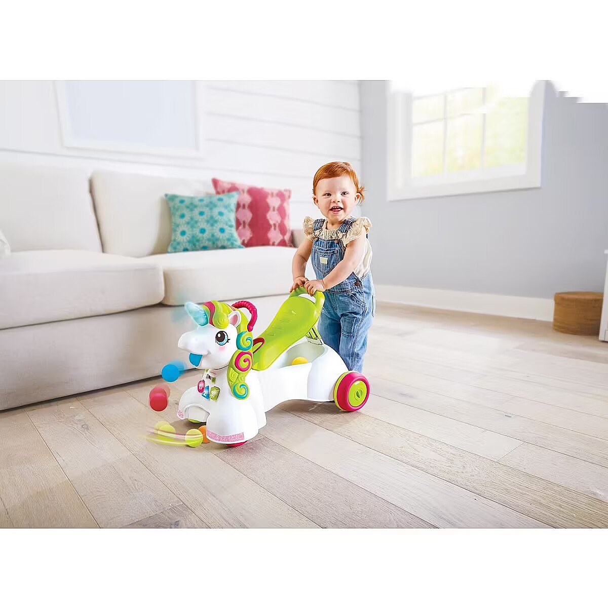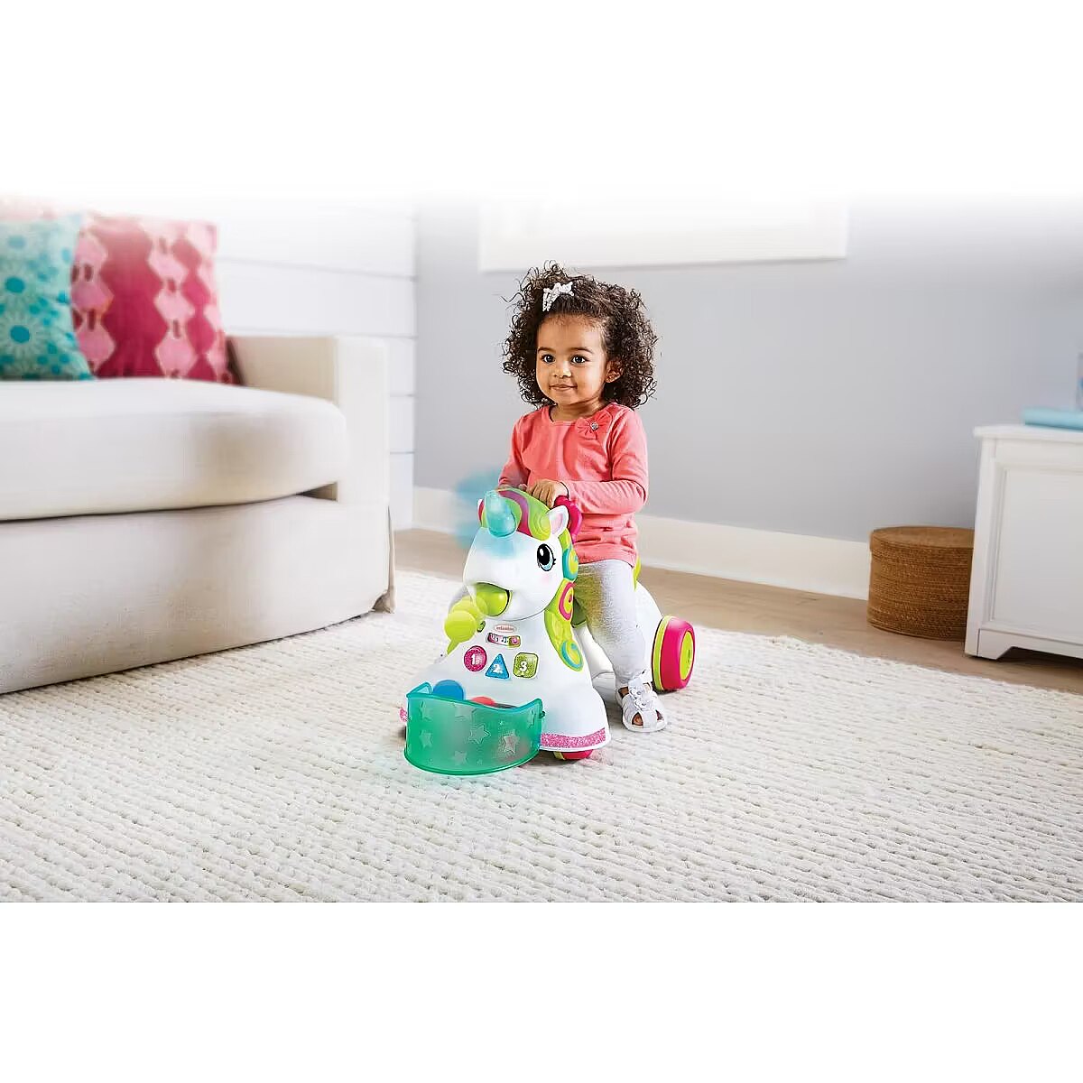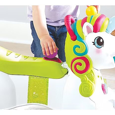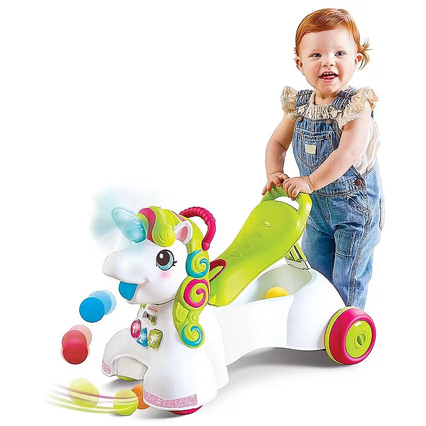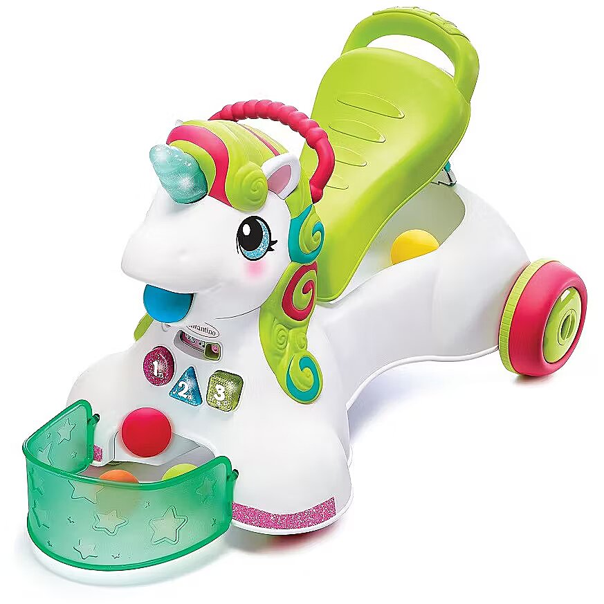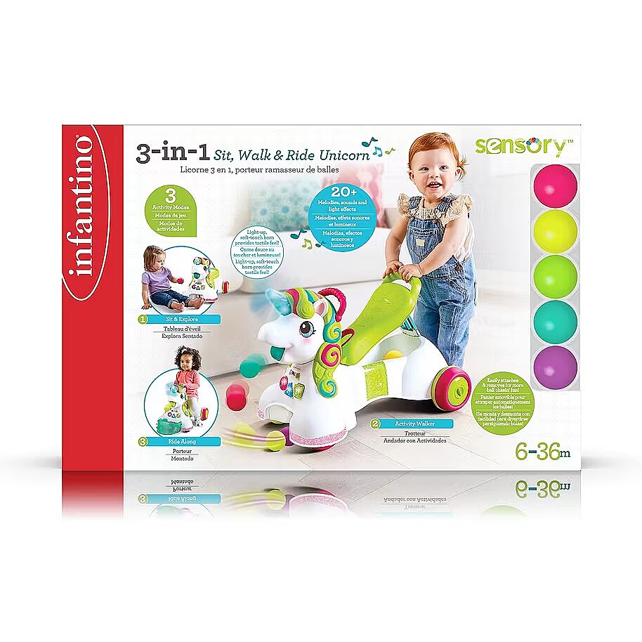 Description - INFANTINO 227018N JEŹDZIK PCHACZ 3 W 1 JEDNOROŻEC Tym jeździkiem można się bawić na wiele różnych sposobów. Można go używać jako centrum zabawy (6M+), pchacz (12M+) lub jeździk (16M+). Siedzące dzieci uczą się kolorów, kształtów i liczb na podstawie podświetlanych przycisków i dźwięków. Gdy dziecko stawia pierwsze kroki, może trzymać się uchwytu z tyłu siedziska. Siedzisko podnosi się do chodzenia, a opuszcza się do jeżdżenia, zawiera również schowek na piłki. Jeździk jednorożec to ponad 20 efektów dźwiękowych i świetlnych. Grzywa jednorożca jest kolorowa i posiada różne faktury. Prędkość kół można regulować dla początkujących i zaawansowanych spacerowiczów. Jeździk zawiera 5 kolorowych piłek, które można umieścić w koszyku na przodzie lub w schowku pod siedziskiem. Jednorożec zbiera rozrzucone piłeczki, a następnie wyrzuca je na podłogę lub do koszyka. Róg jednorożca został wykonany z miękkiego materiału i zaświeci się po dotknięciu! 2 prędkości kół (regulowane na tylnych kołach). Zalety: Rozwija umiejętności, wyobraźnię Ćwiczy koordynację ruchową dziecka Wesołe kolory przyciągną uwagę każdego maluszka