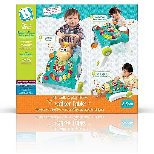 Description - B-KIDS 3993NN PCHACZ 3 W 1 KONIK To muzyczne centrum zabawy w jednej chwili może zamienić się w chodzik, muzyczny stół lub centrum do zabawy dla dziecka siedzącego lub leżącego na brzuszku.  Klawiatura posiada dwa tryby: Klawisze wygrywają 5 wesołych melodii Klawisze wydają pojedyncze dźwięki  Podczas zabawy migają 3 kolorowe światełka LED. Przyciski o różnych kształtach wydają wesołe dźwięki np: perkusji, bębenka, grzechoczących koralików, galopującego konika. Mnóstwo pomysłów na zabawę stymulującą rozwój dziecka. Zabawka posiada 2 tryby głośności.