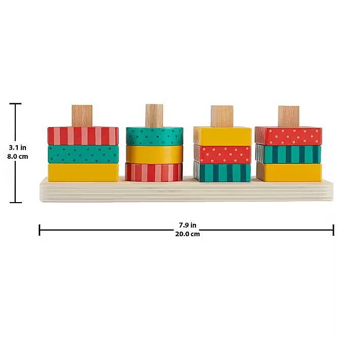 LongDesc - The Wooden Shape Stacker from Fisher-Price features colourful wooden triangles, circles, rectangles and squares for toddlers to sort and stack on to the base. Made with wood from Forest Stewardship Council-certified sources (FSC-N004566) and decorated with non-toxic, water-based paints, this stacking toy helps foster fine motor activities and introduces colours, shapes, counting and more. Colours and decorations may vary.