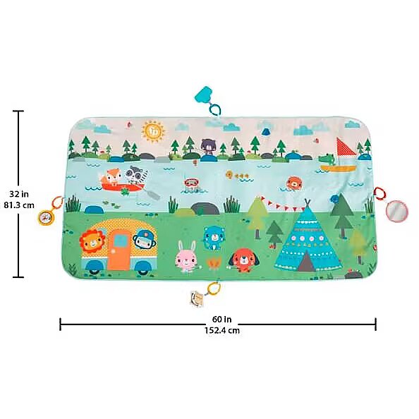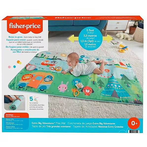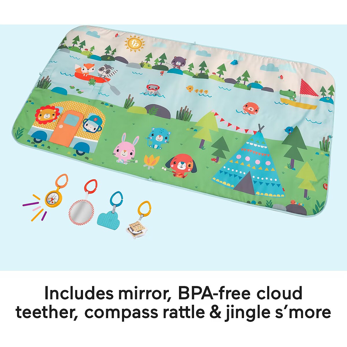 LongDesc - Baby can pack up and head out for exciting “outdoor” adventures with the Extra Big Adventures Play Mat from Fisher-Price. This extra-large, camping-themed activity mat measures 60 inches long, providing lots of space for little campers to explore the campground and engage with the activity toys, including a compass rattle, high-contrast mirror, jingling s’more and BPA-free cloud teething toy. The machine-washable mat easily rolls up, so you can take it along wherever you and baby roam! The large play space and fun toys help keep babies engaged in lay & play and tummy time, helping work neck and core strength and fine motor skills.