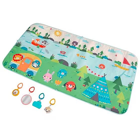 Description - With the Fisher-Price Big Adventure Mat, toddlers can explore unusual places and have fun. The extra-large mat with camping motif is over 152 cm long and provides plenty of space to explore. Activity toys such as a compass rattle, mirror, sweet marshmallow with bell and bisphenol A free cloud teether will keep your little one occupied for ages. The mat is machine washable and rolls up to take with you wherever you want. Plenty of play space and cute toys provide lots of fun for back and tummy play, helping to strengthen neck and torso muscles and develop baby's dexterity. Extra large play mat (152 x 81 cm) with baby camping theme 4 toys including mirror, bisphenol A free cloud teether, rattle compass and soft sweet foam with bell A rustling door a kukuku and ribbons on the sensory play mat Collapses for easy storage or playtime away from home The perfect gift for a toddler from birth