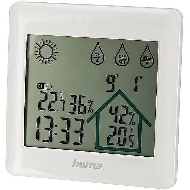 Description - For the digital display of temperature, humidity, time, date and weather forecast Displays a weather forecast with four symbols: sunny, slightly cloudy, cloudy, rainy Displays indoor and outdoor air humidity Intuitive operation with 3 touch sensors on the display Thermometer: Display of indoor and outdoor temperature Storage of the min./max. values for temperature  Can be switched between degrees Celsius and degrees Fahrenheit Hygrometer: Storage of the min./max. ambient humidity values Display of the time and date