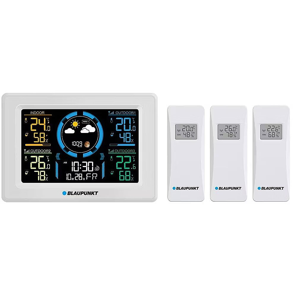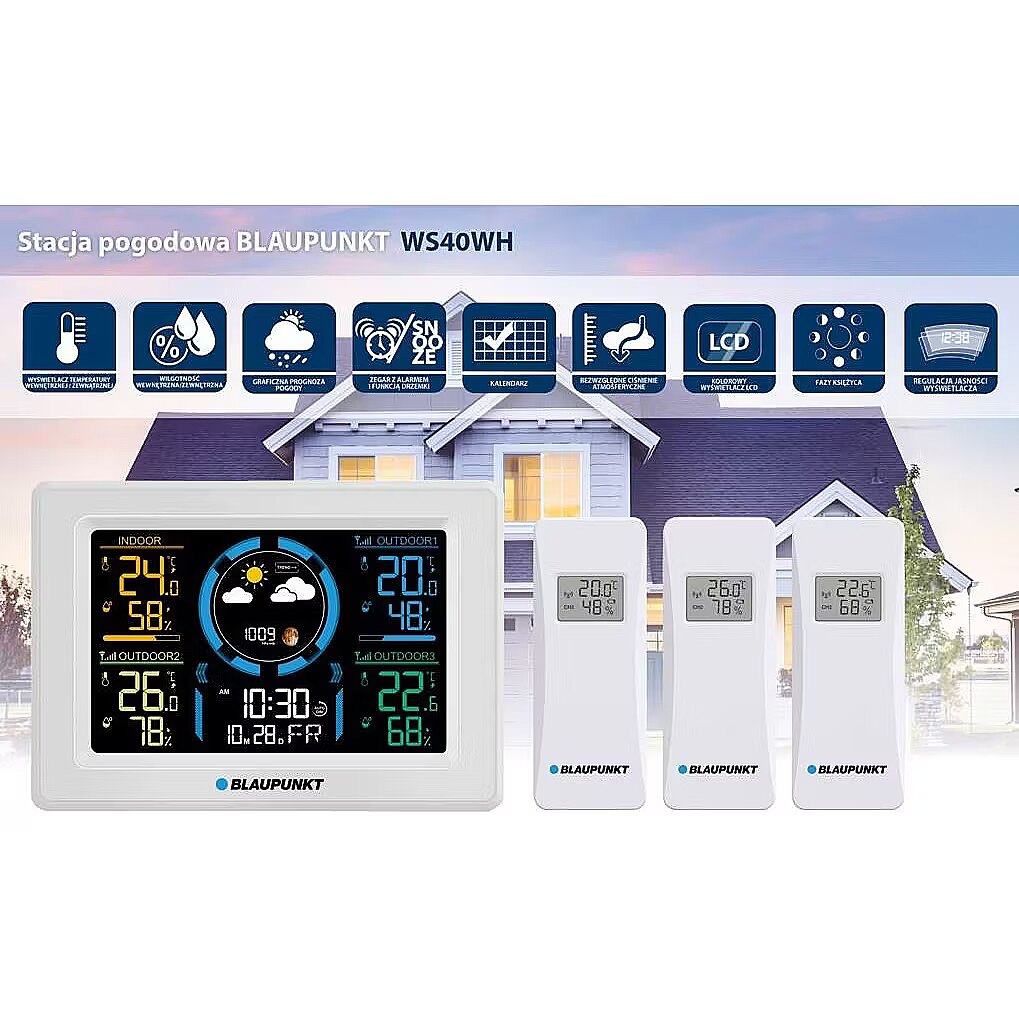 Description - WS40WH weather station Weather station with three wireless sensors for measuring temperature and humidity, absolute atmospheric pressure reading, temperature and humidity trend indicator, clock and calendar, alarm function, and display of moon phases. Powered by the supplied AC adapter or optional batteries. Climate under quadruple control! Thanks to the multifunctional display of the WS40BK weather station, you can control readings from four temperature and humidity sensors at the same time. One sensor is built into the weather station, the other three can be placed anywhere outside, in the bedroom or in the garage. Thanks to the LCD displays in the sensors, you can also read the data while being close to them. Thermometer and hygrometer always at hand! The Blaupunkt WS40BK weather station has a built-in sensor for measuring temperature and humidity inside the room in which it is installed. Three additional wireless sensors with LCD displays included in the set can perform measurements outdoors or in any selected location. Data regarding both temperature and humidity measurements are constantly updated and displayed on the LCD display built into the weather station*. Additionally, the device has a memory for measuring the lowest and highest values of both temperature and humidity, which reset automatically at the beginning of the next day. Temperature values can be displayed in either degrees Celsius or degrees Farenheit. Get to know the trends in your environment, including weather trends. In addition to reading temperature and humidity, trend indicators for these parameters are available. The arrows appearing on the screen indicate how the measured values have changed over the last hour. An up arrow means that a given parameter has increased its value, a down arrow indicates a decrease in the value of a given parameter, and a horizontal arrow means that a given value has not changed. You don't have to wait for the weather forecast, just take a look at our station! The display of the WS40BK weather station also provides a graphical weather forecast for the next 12-24 hours. Please remember that this forecast is calculated based on atmospheric pressure fluctuations and has limited accuracy, but it is a useful tool for estimating weather conditions for the next few hours in a specific place. Depending on the prevailing conditions, pictograms are available predicting sunny, partly cloudy, cloudy, rainy or snowy weather. The blood pressure is dropping, time for a cup of coffee! The WS40BK weather station has a built-in sensor for measuring absolute atmospheric pressure, and the reading data appears on the display. If you feel a sudden drop in energy or you are a meteorologist, just look at the display and if your blood pressure is low, it's a sign that you need to prepare a cup of coffee. Please note that this weather station reads absolute atmospheric pressure, which may differ from official weather forecasts. The reason for this difference is that the relative pressure given in official weather forecasts is reduced to sea level. The absolute pressure indicated in this model is the pressure measured at a given location at the appropriate height. Turn up the parameters! The WS40BK weather station has been carefully calibrated in our production plant, and the weather forecast will calibrate automatically during the first two weeks of use. However, if you want to manually adjust it, you can do so during the initial setup. What time is it, what day is it? There is also a clock on the LCD screen that can display the current time in both 12- and 24-hour formats. Thanks to this, the station also functions as a useful watch. Next to the clock, there is also a calendar that will inform you what day of the month it is and what day of the week it is. The names of the days of the week are available in seven languages (DE, EN, FR, IT, SP, DU and DA) and can be changed when setting the calendar. Hello! Incentive! The WS40BK weather station also has an alarm function, so if you need to get up earlier, simply set the time you want the alarm to go off and sleep soundly. The alarm will go off automatically, and if you want to sleep a little longer, turn on the snooze function and the alarm will go off again in 5 minutes. The alarm is triggered by a sound signal that lasts for 2 minutes, long enough to wake up even the heaviest sleepyhead. You can also use the alarm not only to wake up, but also as a reminder of some important events during the day that you don't want to miss. LCD display! Are you going dark? Of course I'm missing the point. The display of the WS40BK weather station has a dimming function and no, it does not cheat, it only changesbrightness of the backlight and, importantly, it does not do it alone. You decide when to dim the display to make it less distracting or more visible. Additionally, it has the function of automatically programming when the display should darken and brighten. You simply set the time you usually go to bed and get up, and the display will dim and brighten accordingly so as not to disturb your sleep. Isn't it useful? Power supply. You can connect the WS40BK weather station to the socket using the supplied 5 V 1200 mA power supply, and the wireless outdoor sensors each with two AA batteries, which are included in the set, a total of 6 pieces. In order for the station to remember the settings during a power outage, you need to buy 3 batteries. AA and install them in the compartment located on the back wall of the housing! The station can operate without these batteries, but after a power outage you will have to make the appropriate settings again. These optional batteries can also serve as an alternative power source if you take the station to a plot where you do not have access to electricity. When running on battery power, the display will automatically turn off to save battery power. Additionally, the LCD screen provides battery level indicators for all 