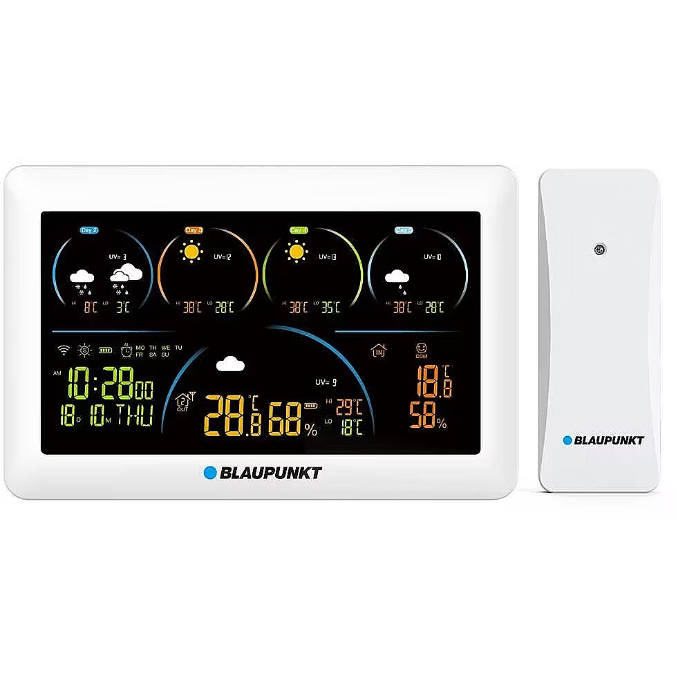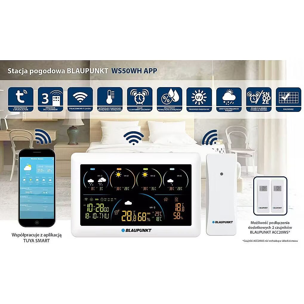 Description - WS50WH APP weather station Weather station compatible with the TUYA SMART application, with a wireless sensor for measuring external temperature and humidity, with a constantly updated weather forecast for the next 5 days via Wi-Fi connection, UV index indicator, clock and calendar and alarm function, as well as with a comfort indicator thermal. Powered by the supplied AC adapter or optional batteries. Your home and mobile weather center. Thanks to cooperation with the TUYA Smart mobile application, you can check all data about the temperature and humidity in your home on your smartphone, regardless of where you are at the moment. After connecting to the local Wi-Fi network, the WS50WH APP weather station will constantly update the weather forecast for the next 5 days by downloading data from the Internet. The device also has a built-in temperature and humidity sensor, thanks to which you will be constantly informed about the thermal situation in your home. The included wireless outdoor sensor will provide you with relevant data about the outdoor temperature and humidity. In the mobile application, you can also set alerts warning you when the set temperature is exceeded and set an alarm clock for all days of the week. You will also receive reports in the form of graphs on the temperature and humidity values on a given day or month. There's Wi-Fi, there's fun! WS50WH APP is a weather station that, thanks to connection to the home Wi-Fi network and cooperation with the TUYA SMART application, can constantly update the weather forecast for the next 5 days. All you need to do is scan the appropriate QR code with your smartphone, which is available both in the user manual and on the box, and download the TUYA SMART application. Then turn on the station and start the Wi-Fi network search function on the weather station by pressing the button on the top panel of the housing. Now open the application and perform the configuration described in the user manual. After correct pairing, the weather station will download data from the Internet and display it on the display. Data on the forecasted highest and lowest temperatures, UV index and graphic weather forecast are updated on an ongoing basis. Remember that the station works with a 2.4 GHz Wi-Fi network or a hybrid 2.4/5 GHz network, but does not support the 5 GHz network. TUYA SMART is smart. The TUYA application contains data from temperature and humidity sensors connected to the WS50WH APP weather station, you can check this data even if you are not within the range of your home Wi-Fi network. The weather station sends this information via a connection to the router and you read it in the TUYA SMART application connected to the Internet anywhere. You went on holiday, but you want to check the weather conditions in your home, nothing simpler! You look at the application and you know everything. Thermometer and hygrometer always at hand! WS50WH APP has a built-in sensor to measure temperature and humidity inside the room where it is applied. The additional wireless sensor included in the set can perform measurements outdoors or in any selected location. Data regarding both temperature and humidity measurements are constantly updated and displayed on the LCD display built into the weather station*. Additionally, the device has a memory for measuring the lowest and highest values of both temperature and humidity, which reset automatically at the beginning of the next day. Temperature values can be displayed in either degrees Celsius or degrees Farenheit. Measurements from one sensor not enough? No problem. The station supports up to three external sensors, so you can buy two additional optional Blaupunkt ACC20WS sensors for the sensor included in the set, set them on the appropriate channels (the sensors have 3 channels, switched manually), so that the signals do not interfere with each other and apply them wherever you just want. You need to monitor the temperature and humidity in your bedroom, garage or home pantry, nothing simpler than that, leave the sensor there and you can read the measurement values on the screen of the WS50WH APP weather station, and thanks to the LCD displays built into the optional ACC20WS sensors, you can also check the temperature and humidity values wherever you place them. What time is it, what day is it? There is also a clock on the LCD screen that can display the current time in both 12 and 24 hour format. Thanks to this, the station also functions as a useful watch. Next to the clock, there is also a calendar that will inform you what day of the month it is and what day of the week it is. The names of the days of the week are available in seven languages (DE, EN, FR, IT, SP, DU and DA) and can be changed when setting the calendar. Hello! Incentive! The WS50WH APP weather station also has an alarm function set in the TUYA SMART application, so if you need to get up earlier, simply set the time at whichyou want the alarm to go off and sleep soundly. The alarm will go off automatically, and if you want to sleep a little longer, turn on the snooze function and the alarm will go off again in 5 minutes. The alarm is triggered by a sound signal that lasts for 2 minutes, long enough to wake up even the heaviest sleepyhead. You can also use the alarm not only to wake up, but also as a reminder of some important events during the day that you don't want to miss. Puff how hot! Phew, how hot! You know that feeling when you're hot and the radiator is still heating up like crazy? Or you're constantly cold because you haven't turned on the heating. To control the appropriate temperature in the room, in the TUYA SMART application connected to the WS50WH APP weather station, you can set alarms that will warn you when previously set temperature ranges are exceeded, both for the sensor built into the station and for external sensors connected to the station. This is how it works: for example, you set the temperature ra