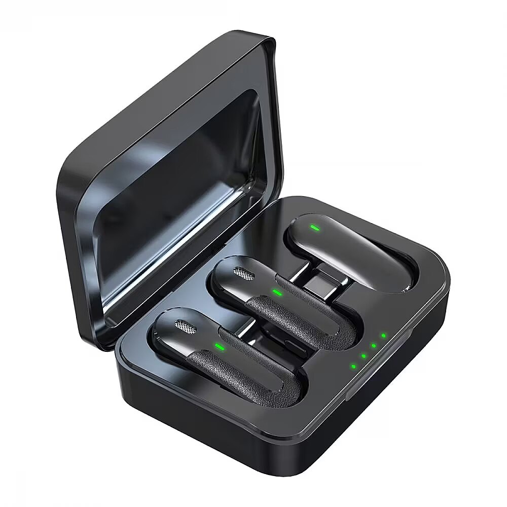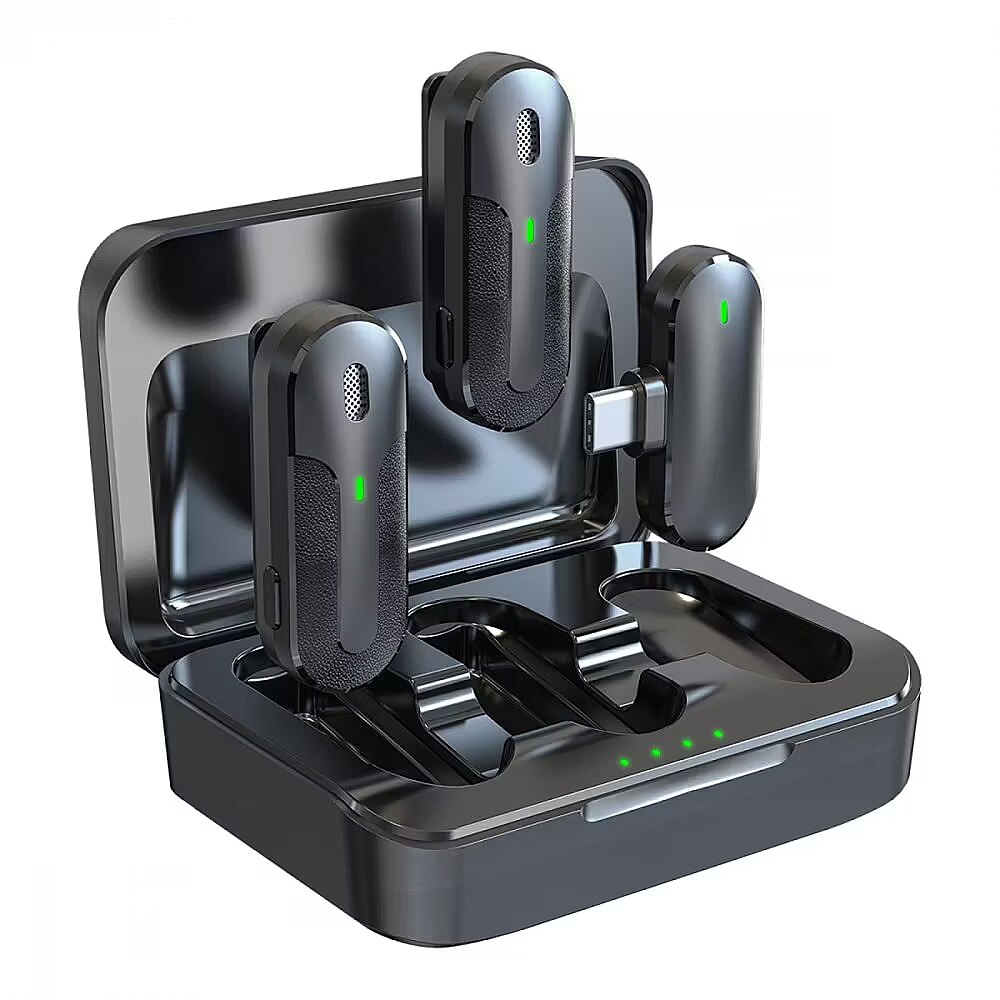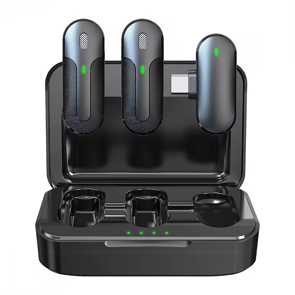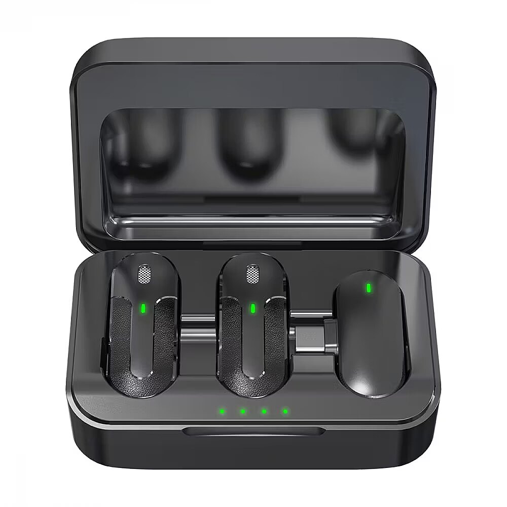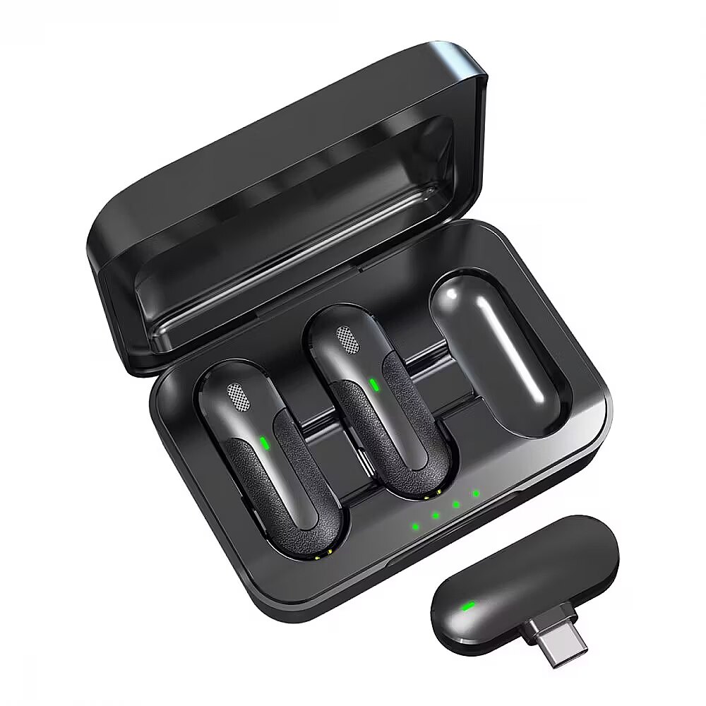 Other features - Frequency / rate 2.4GHz  / 32KHz Transmitting distance About 15m Latency 30ms SNR 64dB (3 level) Battery capacity microphone 2x 70 mAh / 3.7 V / 2x 1g Battery capacity case 600 mAh / 3.7 V / weight 5 g Charging input DC 5 V / 2 A (USB Type C port) Charging time Approx. 1.5 h Recharging times 4 times Working time Approx. 6h Working temperature 0-60°C Material ABS