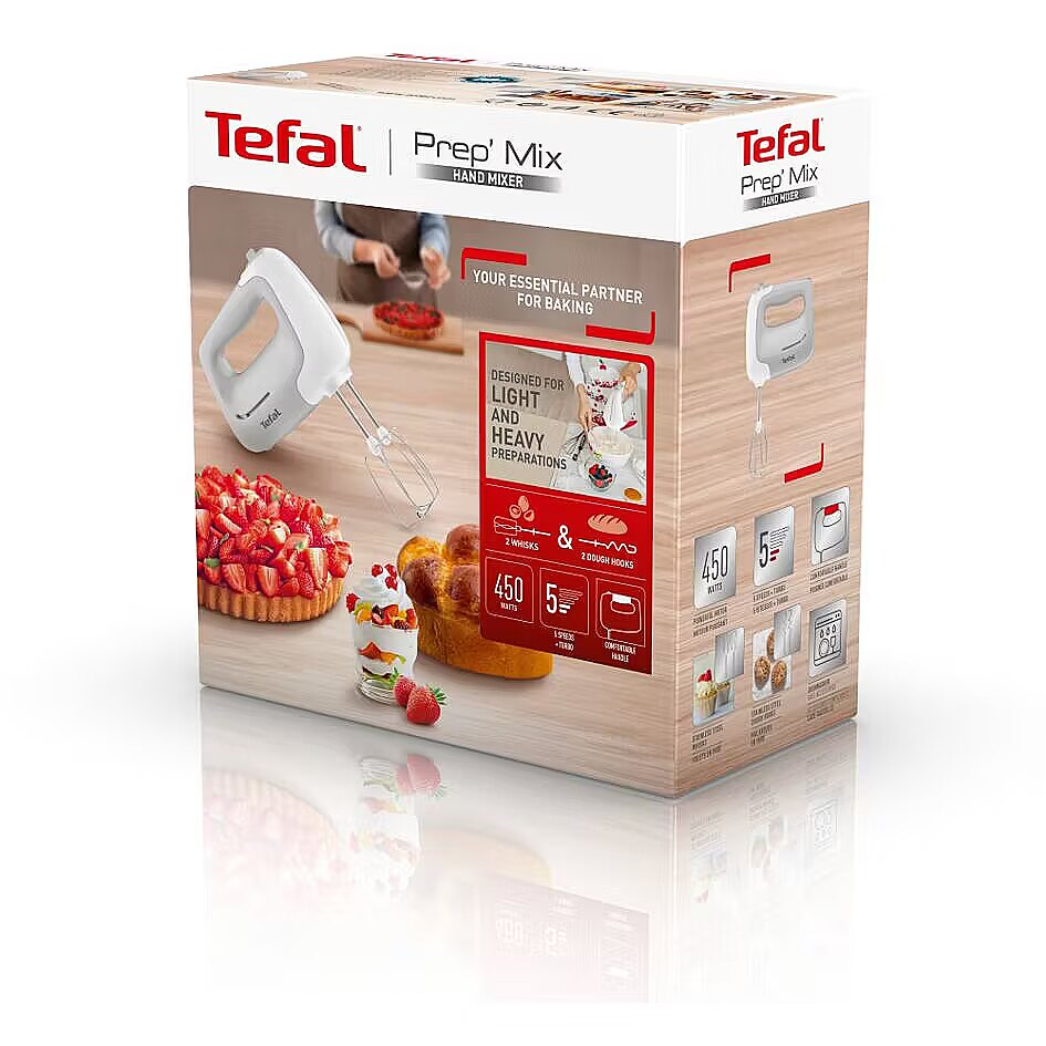 MediumDescription LV - Ļaujiet Tefal rokas mikserim Prep'Mix kļūt par jūsu uzticamo cepšanas palīgu! Pateicoties 450 W motoram un pieciem regulējamiem ātrumiem ar turbo pogu, šis kompaktais, bet jaudīgais elektriskais rokas mikseris bez piepūles risina plašu sagatavošanās darbu klāstu — no viegliem un maigiem, līdz blīviem un smagiem maisījumiem. Iekļauti divi putotāji un divi mīklas āķi no augstas kvalitātes nerūsējošā tērauda — tie visi ir mazgājami trauku mazgājamajā mašīnā, lai nodrošinātu maksimālu ērtību!• GALVENAIS VIRTUVEI: neaizstājams rokas mikseris, kas atbilst daudzpusīgai veiktspējai un ērtai lietošanai visām jūsu ikdienas gatavošanas vajadzībām;