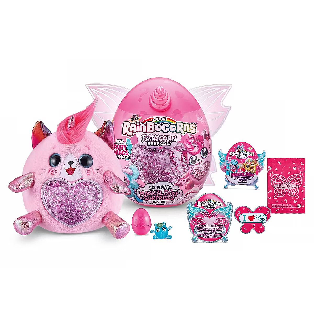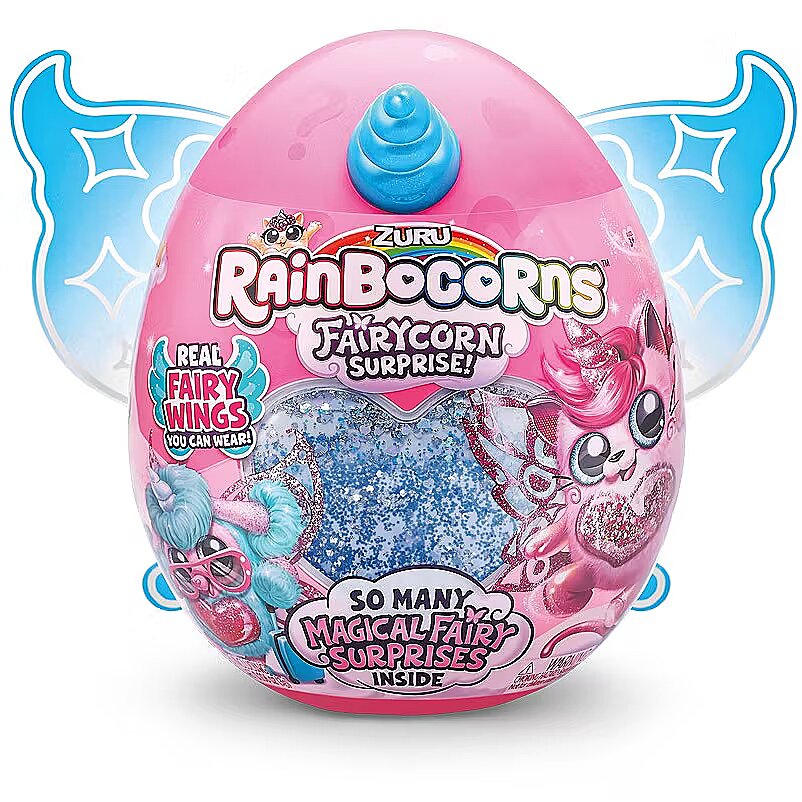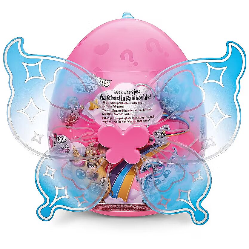 Description - Rainbocorns Fairycorn Surprise Plush, cuddly mascots with little fairy wings. There are 7 different animals in the series, including an owl, a bunny, a hippo and a sheep. Part of the package is a huge glitter heart, which can be removed and placed on the mascot's tummy, and can also be used as a brooch or hairpin. Attached to the packaging are large wings, which can be worn by children thanks to a special elastic band. In addition to the mascot, there are lots of surprises hidden in the egg: a mini Boo-boocorn figurine, unicorn poo (glitter) and a leaflet so you can find out what your mascot likes best. The number of surprise mascots available is 7, each egg has a different colour horn/ears and a glitter heart colour. Product shipped randomly, no specific model available. Price is for 1pc.