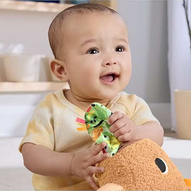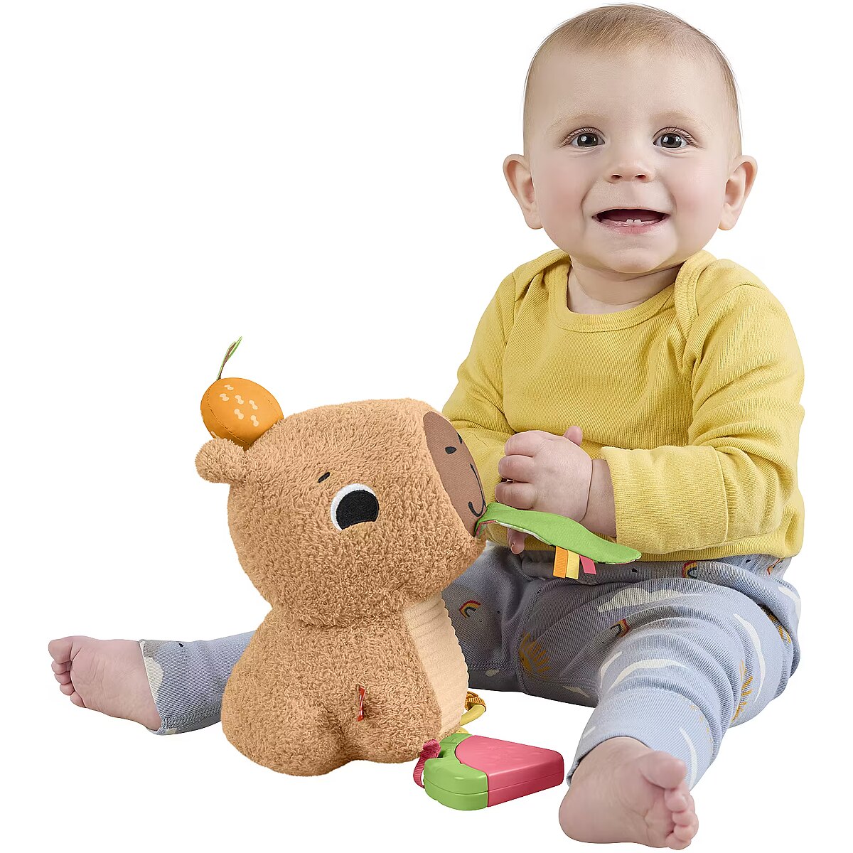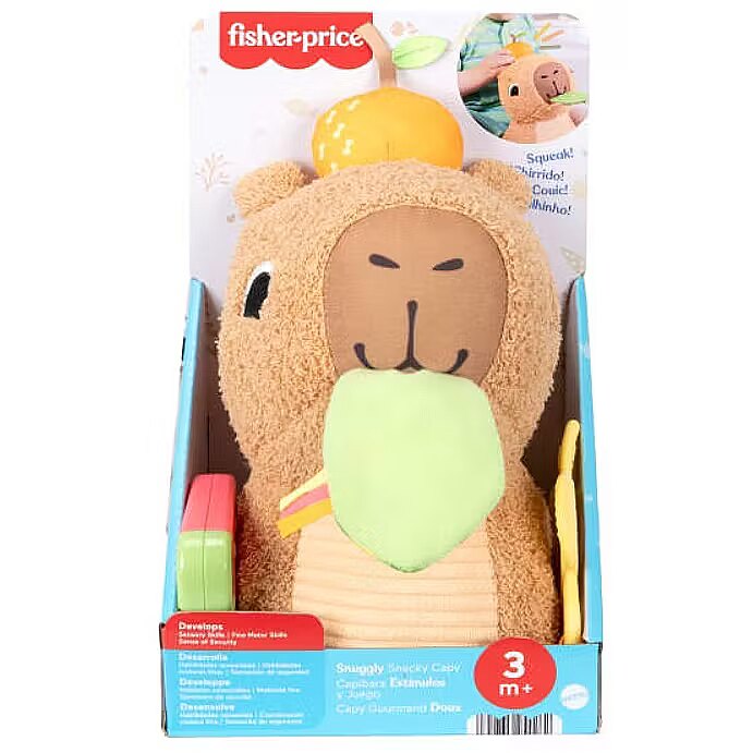 LongDesc - Cute, cuddly, and ready for play, the Snuggly Snacky Capy plush baby toy from Fisher-Price is packed with lots of sensory details for your little one to explore. With bright colours, textured fabrics and fun sounds, the capybara comes with his own “snacks” that are designed to engage your baby’s senses as they play. Sized just right for newborns, this soft, snuggly friend can help provide a sense of comfort and security for your little one at home or when traveling. Colours and decorations may vary.