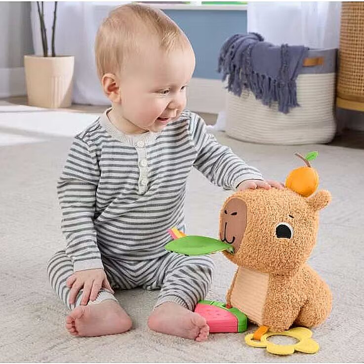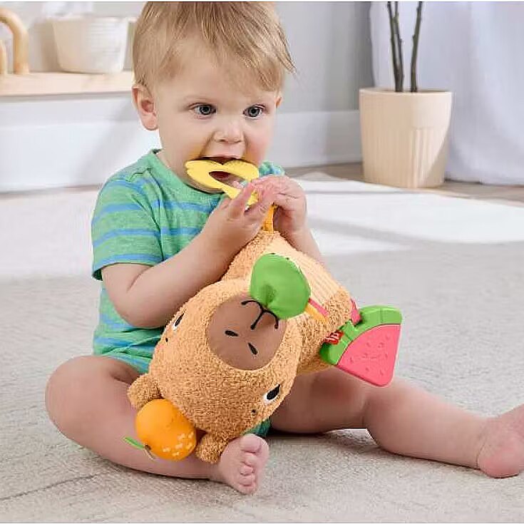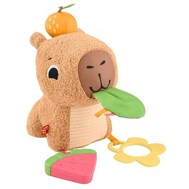 LongSummaryDescription - Fisher-Price Snuggly Snacky Capybara Plush Baby Sensory Toy with Teether & Rattle for Newborns. Product type: Toy capybara, Recommended age (min): 0.25 yr(s), Recommended age (max): 2 yr(s), Sounding