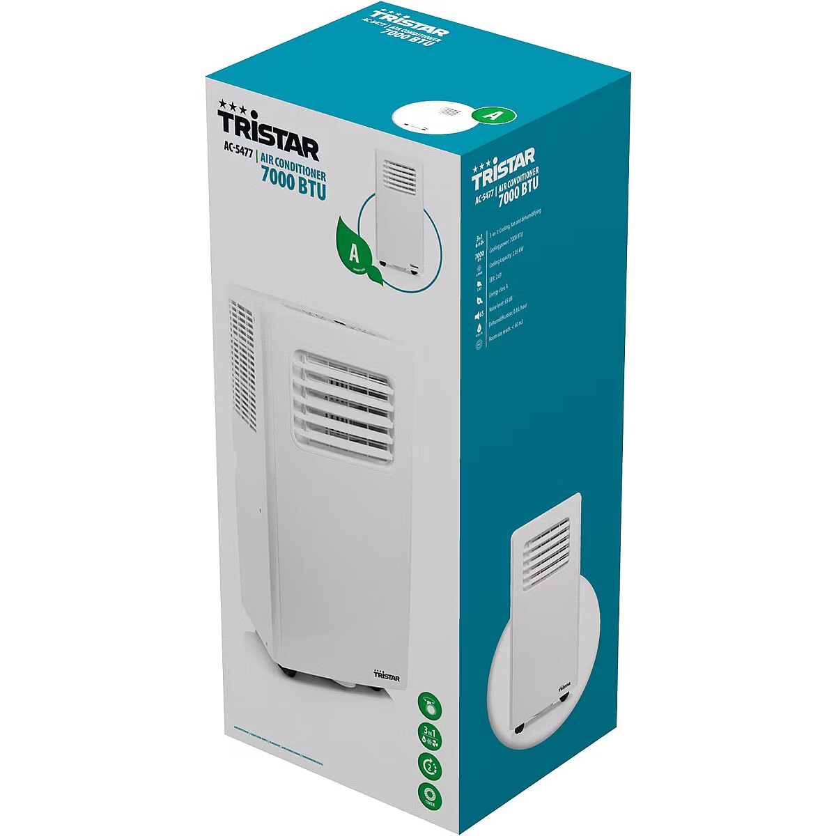 LongDesc - The Tristar mobile air conditioner can be used anywhere cooling is required. The compact and well-designed air conditioner is easy to move and only needs a small amount of space to store. Because the cooling effect can be felt immediately, you will really enjoy the coolness on a hot summer day. It has a low energy consumption and is marked with energy label A. Adjust to your own preferencesThe cooling capacity of the AC-5477 Air Conditioner is 7000 BTU and 2.05 kW, which makes the air conditioner suitable for a room up to 60m3. The produced airflow is 320m3 per hour. You can select the temperature yourself with a range from 16⁰C to 31⁰C. The air conditioner has three different operation modes: cooling, dehumidifying and fan.Drying and fanWhen using Tristar air conditioner as a fan, there are two fan speeds possible. You can decide to use the air conditioner to dry the air, with a dehumidification of 0.8 litre per hour. The water tank has a volume of 0.5 litre and a full tank indicator. With this extra function, you will not be bothered anymore by humid or oppressive air. Dry air cools faster so you can cool more efficiently when the air is dry.Easy to controlOperating the Tristar air conditioner is very easy. Thanks to the remote control, you can easily control the mobile air conditioner from a distance. You can also set the timer so the air conditioner activates or deactivates itself. You can control the climate in your home at all time, even when you are asleep or from the comfort of your chair! Practical to useYou can also easily move the Tristar mobile air conditioner thanks to the castors, therefore, you can use it anywhere you want to. Thanks to its compact size, it does not take up too much space in your room and it also allows you to easily store it after the summer. Tristar offers you 24 months warranty on all products.What’s in the box:Tristar Air conditioner, hose, remote control, instruction manual