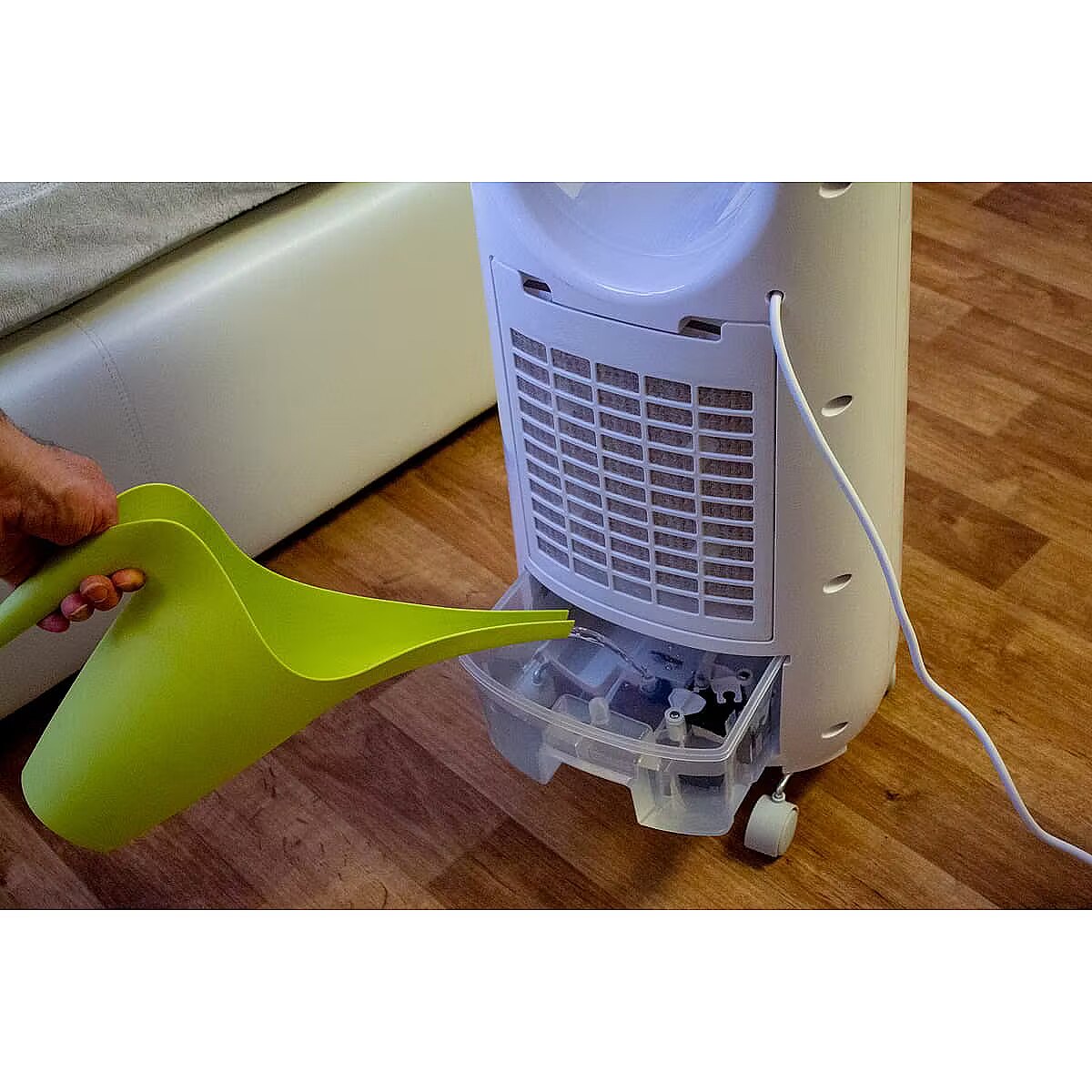 Klimator jest znacznie delikatniejszy i oszczędniejszy niż standardowa klimatyzacja. Urządzenie wdmuchuje powietrze przez filtry wody, co je chłodzi. Do pracy wystarczy napełnić 5 litrowy zbiornik wodą. Jeśli chcesz jeszcze bardziej schłodzić powietrze, dodaj do zbiornika wkłady chłodzące, które są w zestawie. W przypadku braku wody zostaniesz o tym poinformowany sygnałem dźwiękowym. W przypadku wyjęcia zbiornika na wodę lub jego opróżnienia urządzenie wyłączy się automatycznie. Tryby pracy