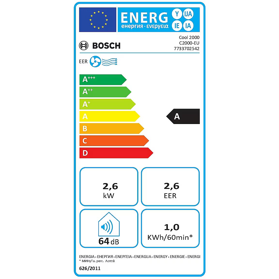 ShortSummaryDescription - Bosch Cool 2000, A, 1 kWh, A+++ to D, White, LED, 420 mm