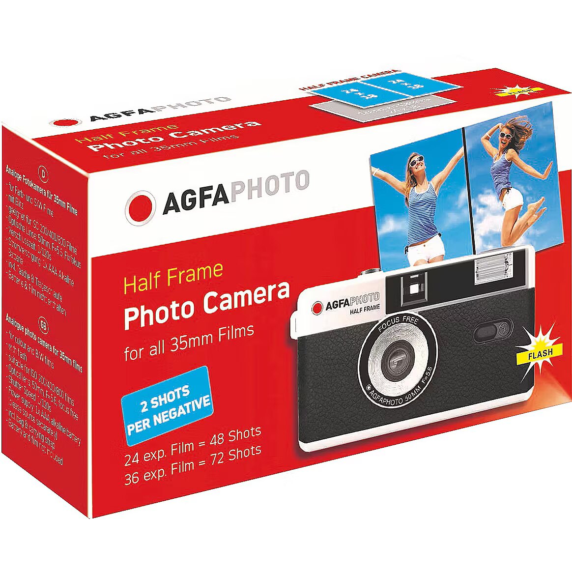 description_en - AgfaPhoto half frame film camera will allow you to double up on your 35 mm film and yield double the photos. For example, a film roll with 36 exposures can yield around 72 half-frame photos. This camera features a built-in flash, a lightweight body, making it the perfect camera for travel or any social occasion. Film format: 35mm (Half Frame) 50 mm f/5.6 lens Shutter release: 1/120s Built-in flash Power supply: 1 × AAA Alkaline Battery NB! Film and battery are not included.
