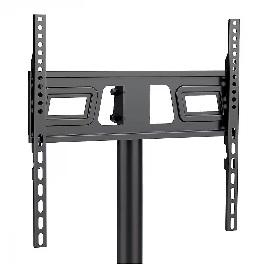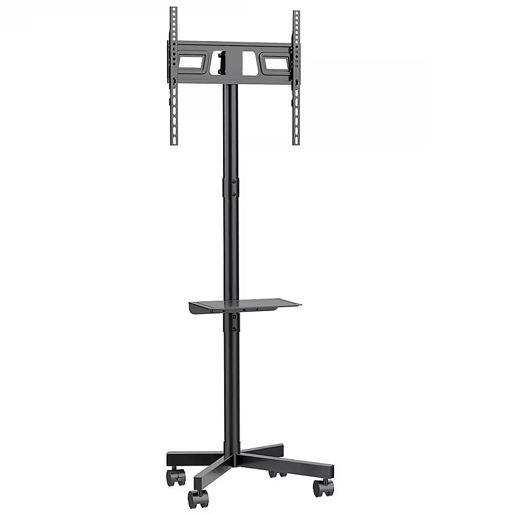 The stand is characterized by a practical design, very simple installation and a very wide range of televisions that we can mount on it. The built-in lower shelf allows you to mount optional accessories such as DVD, receiver, tablet, laptop, console, etc. The stand is also equipped with four wheels, so you can easily move the entire set to any location. The set comes with the screws necessary for proper installation and a pictorial installation guide. Ideal for conference rooms, airports, public displays or other professional presentations.