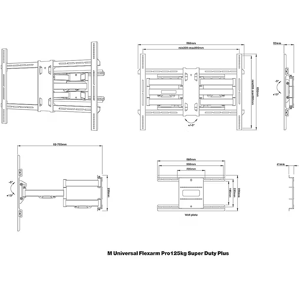 LongSummaryDescription - Multibrackets M Universal Flexarm Pro 125kg Super Duty Plus. Maximum weight capacity: 125 kg, Minimum screen size: 139.7 cm (55"), Maximum screen size: 2.79 m (110"), Minimum VESA mount: 200 x 200 mm, Maximum VESA mount: 800 x 600 mm. Tilt angle range: -5 - 15°, Swivel angle range: -45 - 45°, Distance to the wall (min): 8.4 cm, Distance to the wall (max): 71 cm. Product colour: Black