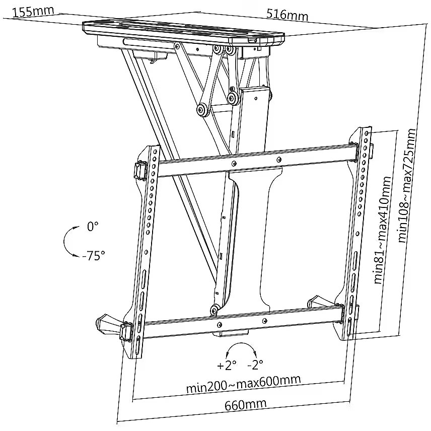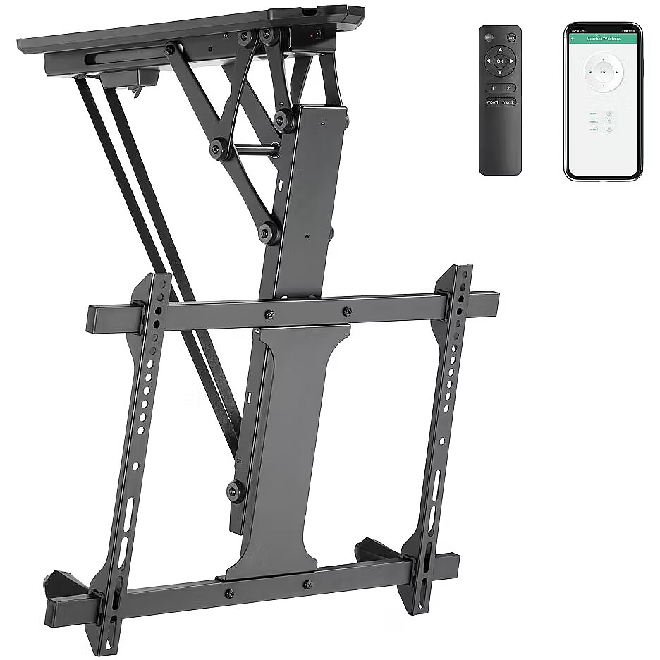 Description - Electric ceiling TV mount with Smart Home integration via Tuya app. The high-quality motor supports TVs from 32" to 70" and smoothly and quietly lowers and raises the TV. Programmable position memory function: saves the selected position. Integrated cable management: keeps things tidy. Easy position control via remote control or app with memory function for selected positions. Control via Amazon Alexa and Google Home: effortlessly adjust the position of your TV with a simple voice command. Dimensions: 725 x 664 x 516 mm; surface finish: powder coated; colour: black.