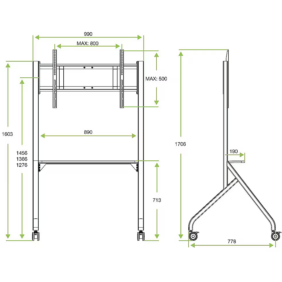 LongSummaryDescription - Techly ICA-TR53MB. Maximum weight capacity: 80 kg, Minimum screen size: 165.1 cm (65"), Maximum screen size: 2.03 m (80"), Minimum VESA mount: 75 x 75 mm, Maximum VESA mount: 800 x 500 mm. Height adjustment range: 1276 - 1456 mm. Product colour: Black