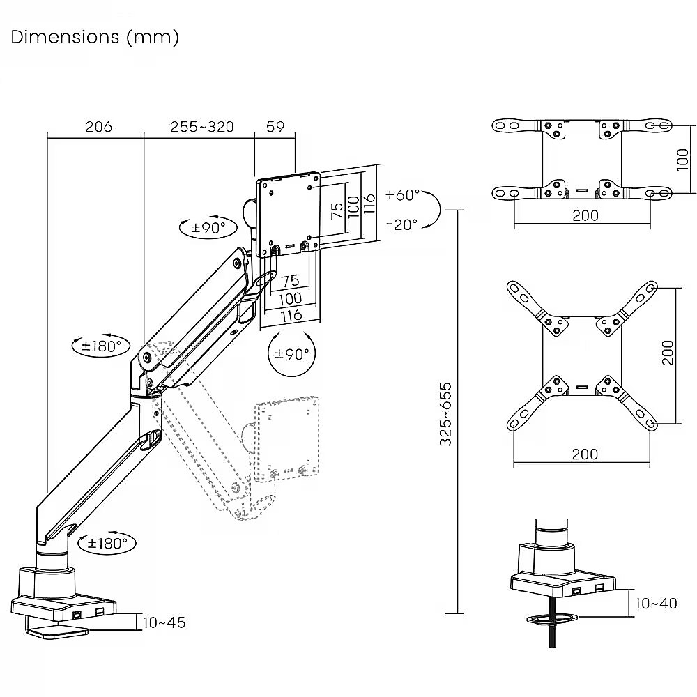 Other features - - Designed for monitors with screen diagonal from 17 to 57 inches - Maximum load: 27 kg - Adjustable tilt from -20 to +60 degrees - VESA: 75x75, 100x100, 200x100, 200x200 mm - Cable masking system - Very high quality workmanship - Gas spring - Attaches to desk top or in cable hole