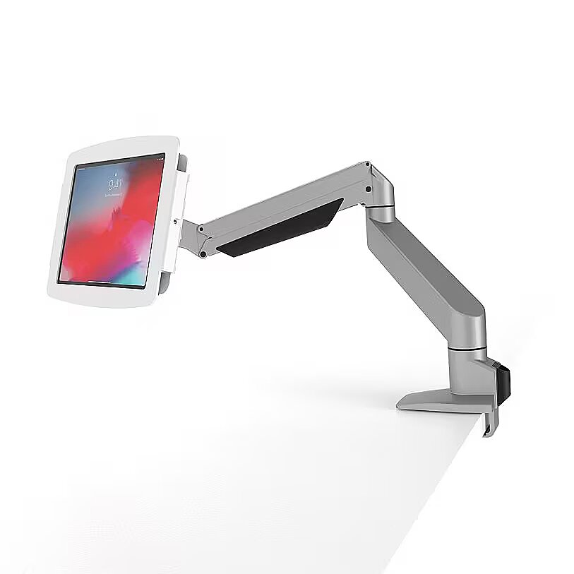 LongDesc - The Space iPad Enclosure features rounded edges and open corners for improved ventilation and allows for limited access to buttons and inputs. Included is a removable home button cover to restrict access to the main button.As with all our iPad lock and tablet lock devices, the tablet can be continuously charged while in the enclosure and have peripheral cables plugged in while mounted.Our Reach Articulating Arm stand can be securely clamped on a desk or counter-top or to a wall (with additional bracket) for use as ergonomic desk companion. Allow your work space to “Reach new heights” with the Reach iPad Articulating desk mount. Tilt, swivel, extend and retract your iPad with a smooth gliding motion that can be easily adjusted to your liking.