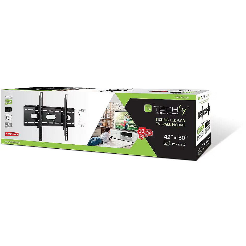 LongSummaryDescription - Techly Tilting Wall Mount for TV LED LCD 42-80" Black. Maximum weight capacity: 80 kg, Minimum screen size: 106.7 cm (42"), Maximum screen size: 2.03 m (80"), Minimum VESA mount: 200 x 200 mm, Maximum VESA mount: 800 x 500 mm. Tilt angle range: -15 - 15°, Distance to the wall (min): 8.2 cm. Product colour: Black