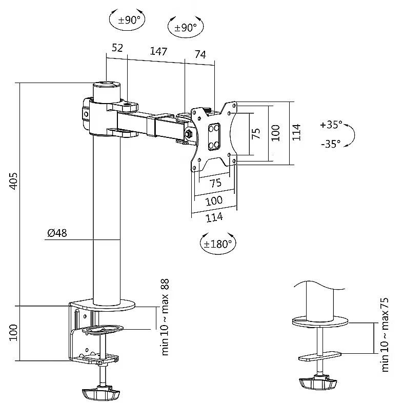 Other features - Mounting type: Table clamp or grommet mounting Dimensions front panel WxH: 114x114 mm Pole height: 405 mm, pole diameter: 48 mm Freely adjustable height: For an optimal ergonomic position Full movement, easy to adjust and without tools Cable management: Elegantly hides all cables connected to the monitor