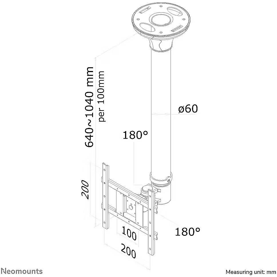 LongSummaryDescription - Neomounts FPMA-C200 Monitor/TV mount ceiling 10-40" - h 64-104 cm. Maximum weight capacity: 20 kg, Minimum screen size: 25.4 cm (10"), Maximum screen size: 101.6 cm (40"), Minimum VESA mount: 75 x 75 mm, Maximum VESA mount: 200 x 200 mm. Height adjustment range: 640 - 1040 mm, Tilt angle range: 0 - 180°, Swivel angle range: 0 - 180°, Angle of rotation: 360°. Product colour: Silver