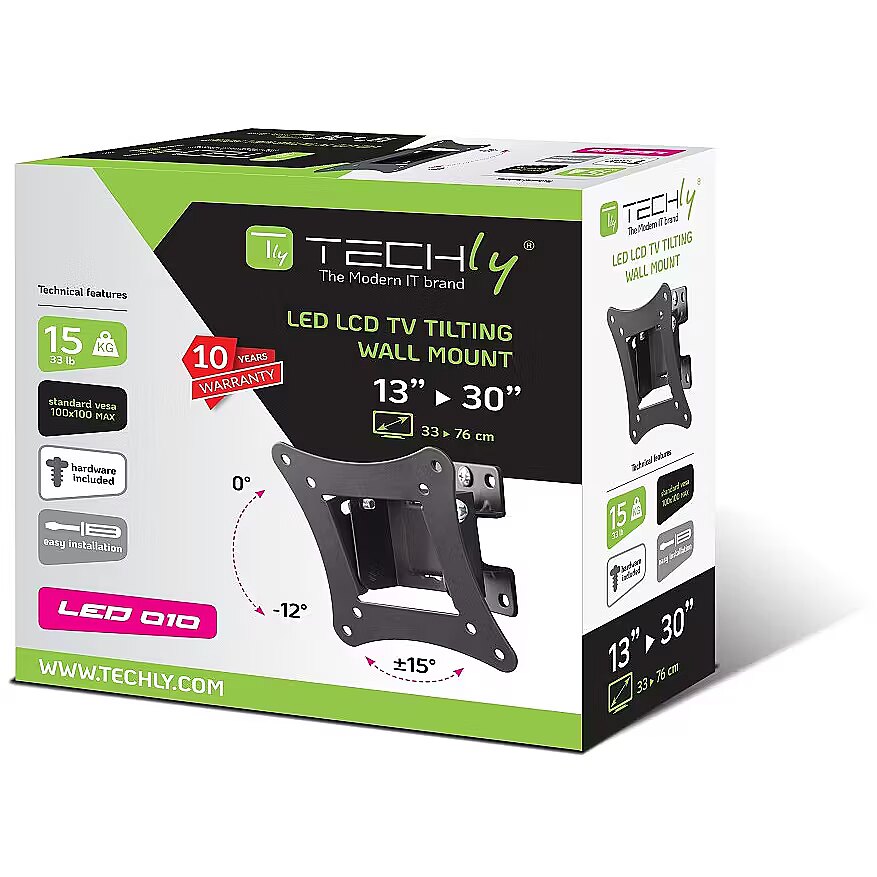 LongSummaryDescription - Techly ICA-LCD-901. Maximum weight capacity: 15 kg, Minimum screen size: 33 cm (13"), Maximum screen size: 76.2 cm (30"), Minimum VESA mount: 75 x 75 mm, Maximum VESA mount: 100 x 100 mm. Tilt angle range: 0 - 12°, Swivel angle range: -15 - 15°, Distance to the wall (min): 5.4 cm. Product colour: Black