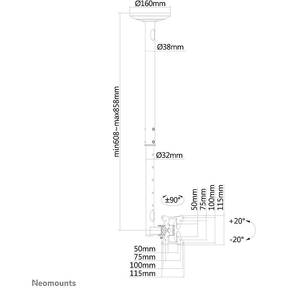 LongDesc - The Neomounts ceiling mount, model FPMA-C050SILVER is a tilt- and swivel ceiling mount for flat screens up to 30". This mount is a great choice for space saving placement or when wall mounting and floor placement is not an option.Neomounts versatile tilt (40°) and swivel (180°) technology allows the mount to change to any viewing angle to fully benefit from the capabilities of the flat screen. The support is easily height adjustable from 50 to 85 centimetres. An innovative cable management conceals and routes cables from ceiling to TV. Hide your cables in the column to keep it nice and tidy.Neomounts FPMA-C050SILVER has two pivot points and is suitable for screens up to 30" (76 cm). The weight capacity of this product is 20 kg. The ceiling mount is suitable for screens that meetVESA hole pattern 50x50 or 100x100mm. Different hole patterns can be covered using Neomounts VESA adapter plates.All installation material is included with the product.