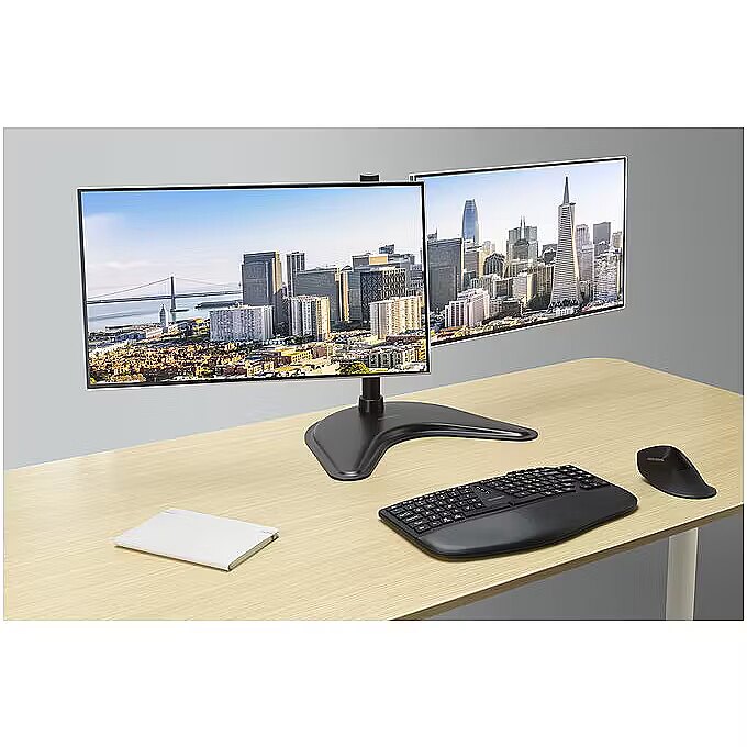LongDesc - Professionals experience increased productivity using dual monitors, but often struggle to find simple ways to setup and adjust their screens. The SmartFit™ Ergo Freestanding Dual Monitor Stand offers the installation convenience of a monitor stand together with the adjustability of a monitor arm, eliminating the need for complex setups. With pan, tilt and swivel adjustments, users can easily customise their viewing angles for optimal comfort and productivity, ensuring a more ergonomic workspace.SmartFit™ - Comfort Made EasySupports proper ergonomic eye-level viewing angles, as well as improved neck and shoulder alignment. Uses data-driven research and a colour-coded fitting chart to support quick and intuitive height-setting.Hassle-Free InstallationFeatures a desktop base mount, eliminating the need for drilling holes or clamping mounts to the desk, while significantly reducing the time and labour costs associated with setting up a dual monitor workstation.Curved Horizontal RailEffortlessly positions monitors in an angled orientation that follows the natural curvature of the human eye, providing a more comfortable and immersive viewing experience. Also consolidates the dual monitor setup’s footprint, freeing up valuable workspace while creating a sleek, integrated aesthetic for the workstation.Sturdy Construction with Weighted BaseConstructed with durable steel materials for long-lasting reliability. Weighted base provides stability and support, ensuring monitors remain securely in place.Dual Monitor SupportAccommodates up to 2 x 27” monitors via a VESA® 75/100 mounting hole pattern. Supports monitors weighing up to 10kg (22lbs) each. ±45° tilt, ±180° rotation and ±15° pan/swivel adjustments.Quick-Release Handle for Toolless Height AdjustmentUp to 430mm (16.9”) monitor height adjustment without the need for tools. The quick-release handle allows for swift and convenient height adjustments, adapting to individual preferences with ease.Silicone Pad for Phone/TabletIncludes a convenient anti-slip silicone pad as a stable surface for phones or tablets.SmartFit™ Brand RefreshIn our ongoing effort to provide additional value to our customers, you may notice variations in SmartFit™ packaging and support materials. The updates are designed to make it easier to identify and use our SmartFit™ products. Rest assured, the quality standards that have made SmartFit™ a trusted choice for ergonomic accessories will remain unchanged.
