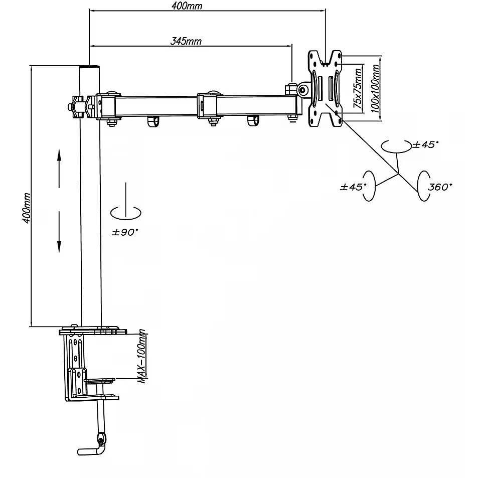 Description - Desk mount for 1 LED/LCD monitor 13-32" L-01XS ART: - features a cable management system - wide adjustment range thanks to three bending points and height adjustment - allows for virtually any monitor position, including pivot mode - dual mounting options: to the edge of the tabletop or in a tabletop opening - vertical adjustment (tilt): -45 to +45 degrees - horizontal adjustment (swivel): -90 to +90 degrees