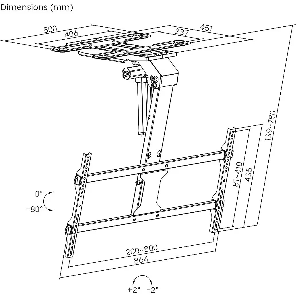 Other features - Producent: Maclean Model: MC-110 T Kolor: czarny Maksymalne obciążenie: 45 kg Przeznaczony dla telewizorów o przekątnej ekranu: od 43 do 86" Regulacja nachylenia: od 0° do -80° Możliwość poziomowania telewizora po zamontowaniu: +/-2° Materiały wykonania: stal malowana proszkowo, plastik, aluminum Sterowanie: darmowa aplikacja Tuya, pilot zdalnego sterowania Kolor: czarny Wymiary: 780 x 864 x 496 mm VESA: 200x100, 200x200, 300x200, 400x200, 300x300, 400x300, 600x200, 400x400, 600x300, 600x400, 800x400 mm Zasilanie: AC 100~240V , 50/60 Hz Długość kabla zasilającego: 1,8 m Rozmiar dołączonych śrub do telewizora: M6x14, M8x16, M6x30, M8x35 Rozmiar dołączonych śrub do sufitu: ST6.3x55
