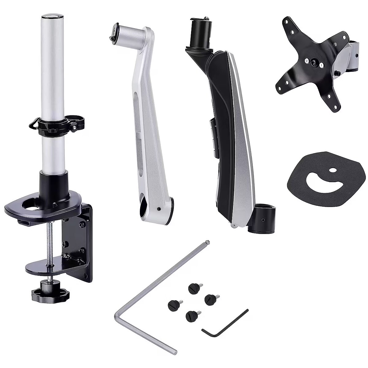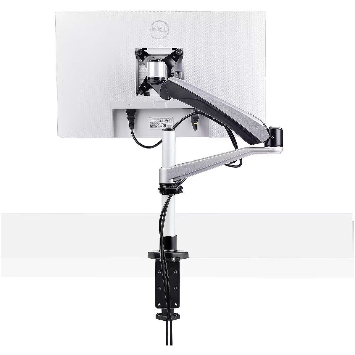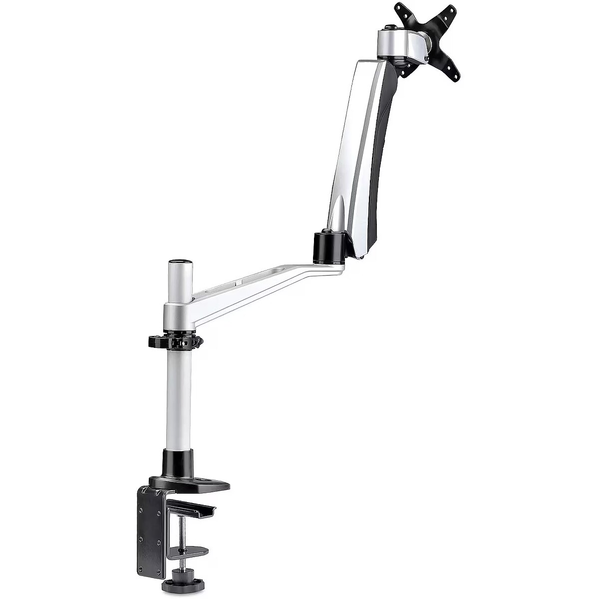 LongDesc - Single monitor desk mount with support up to 30" monitors and height-adjustable articulating armThis monitor desk mount is designed to support up to 27-inch 16:9 or 30-inch 21:9 display, creating an ergonomic area for productivity. The mechanical spring-assisted arm enables multiple adjustment to suit different ergonomic needs.Height Adjustment with One Smooth MotionThe spring arm enables toolless height adjustment of up to 10.6in (270mm) with effortless one-touch motion. Adjust the height of the arm along the 10.2in (261mm) pole. The arm can extend up to 22.2in (590mm) from the pole.Toolless AssemblyThe quick toolless slide and click design makes assembly quick and simple. The pre-assembled desk clamp and pole can be easily secured by hand to the desk, saving total installation time.Range of MotionThe articulating arm enables toolless adjustments of +/-180° horizontal swivel, 105° tilt, 240° pan, and 360° screen rotation on the VESA plate for portrait or landscape orientations. This flexibility enables users to customize the screen placement for maximum productivity and comfort.Durable ConstructionWith its steel and aluminum construction, the premium monitor arm supports a weight capacity of 19.8 lb. (9 kg). Die-cast aluminum arms with mechanical springs that passed 10,000 cycle test and are backed for 10 years for long-lasting performance.Cable ManagementTo maintain an organized workspace, the adjustable arm features a cable management channel along the underside to keep cables out of sight, reducing clutter and contributing to a tidy setup. A cable clip on the pole also helps maintain an organized workspace.The StarTech.com Advantage