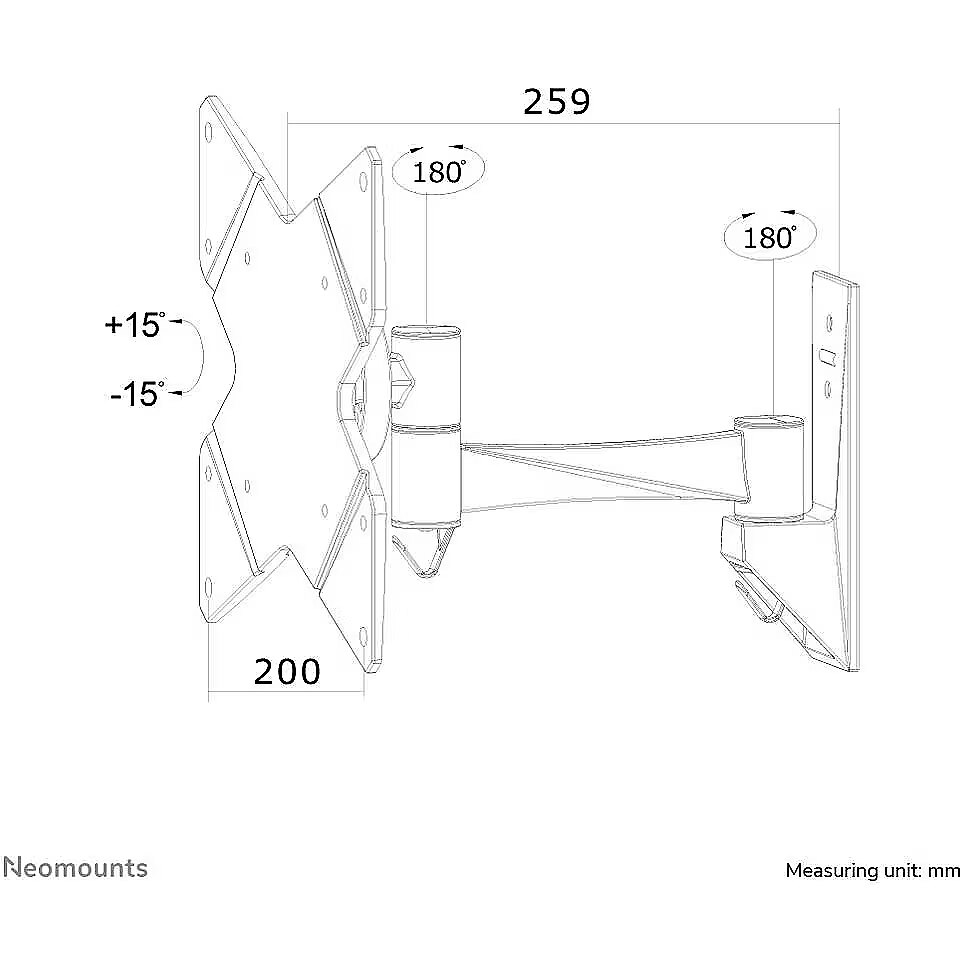 Description - The NewStar wall mount, model FPMA-W825 is a tilt-, swivel and rotatable wall mount for flat screens up to 40”. This mount is a great choice when you want the ultimate viewing flexibility with your flat screen. Effortless pull the display out from the wall, position it in almost any direction, turn it around corners and then smoothly return it to the wall when finished. NewStars’ tilt (30°), rotate (360°) and swivel (180°) technology allows the mount to change to any viewing angle to fully benefit from the capabilities of the flat screen. The mount is easily depth adjustable from 9 to 26 centimetres. Cable management conceals and routes cables from mount to flat screen. Hide your cables to keep living room, bedroom or home cinema installation nice and tidy. NewStar FPMA-W825 has two pivot points and is suitable for screens up to 40" (100 cm). The weight capacity of this product is 20 kg each screen. The wall mount is suitable for screens that meet VESA hole pattern 75x75 to 200x200mm. Different hole patterns can be covered using NewStar VESA adapter plates. Create a clean design ambiance for your flat screen TV in the living room, bedroom or home cinema. All installation material is included with the product. Screens: 1 Screen size: 10-40" Max. weight:20 kg Distance to wall: 9-26 cm VESA minimum: 75x75mm VESA maximum: 200x200mm Tilt: 30° Rotation: 360° Swivel: 180°