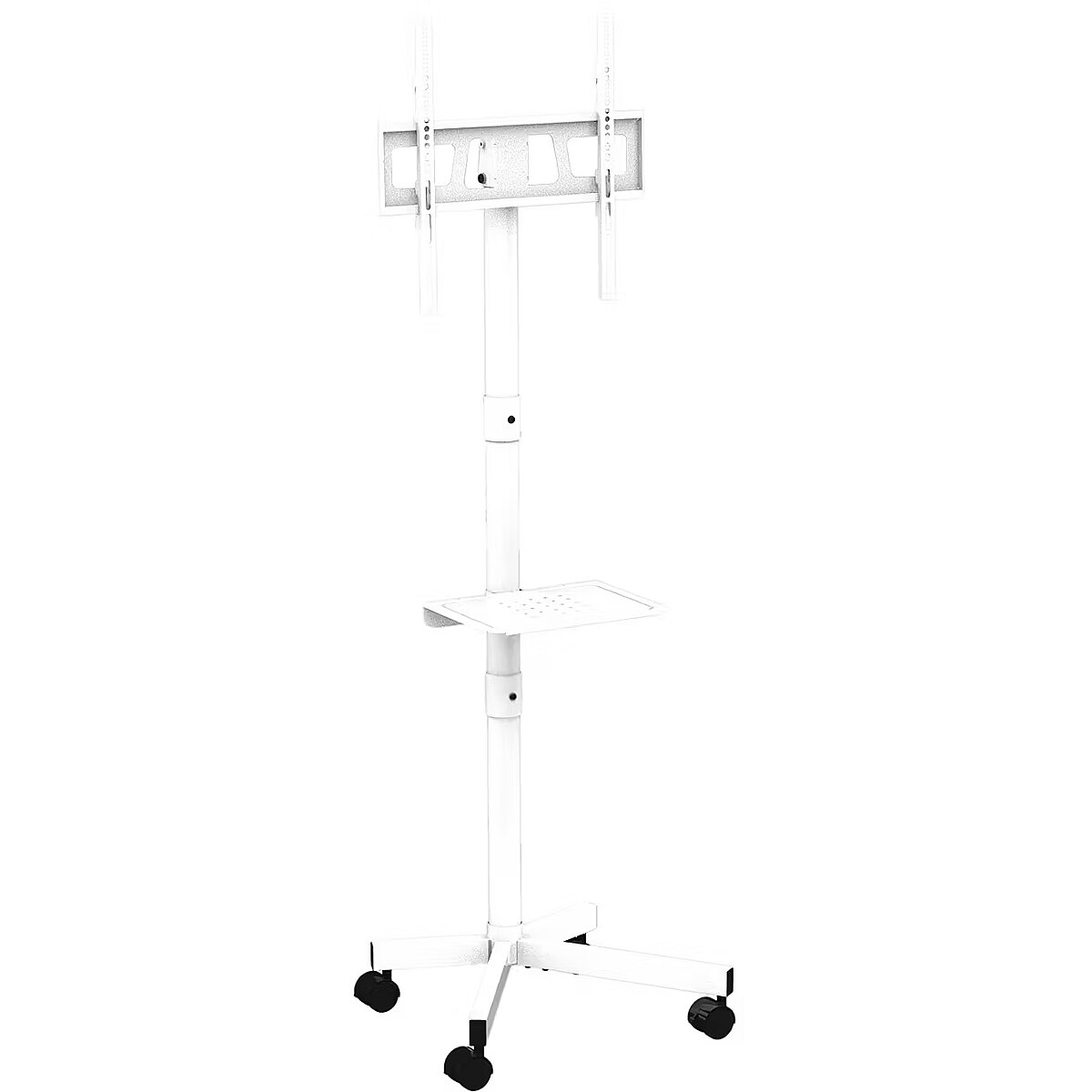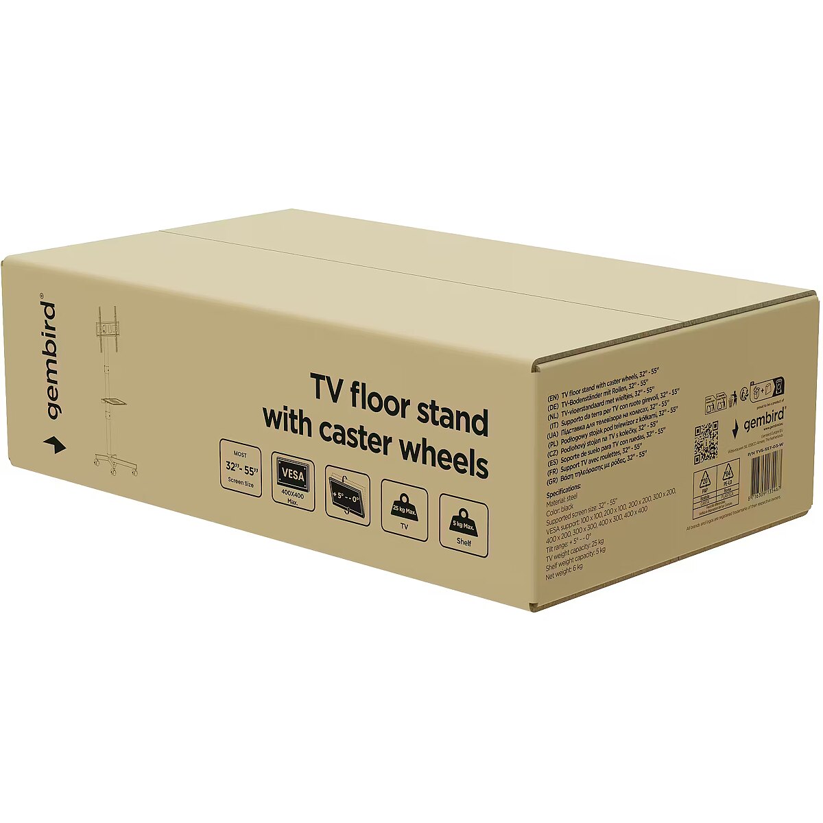 Summary - Gembird TV floor stand with caster wheels, 32" - 55". Maximum weight capacity: 30 kg, Minimum screen size: 81.3 cm (32"), Maximum screen size: 139.7 cm (55"), Minimum VESA mount: 100 x 100 mm, Maximum VESA mount: 400 x 400 mm. Tilt angle range: -5 - 0°. Product colour: White