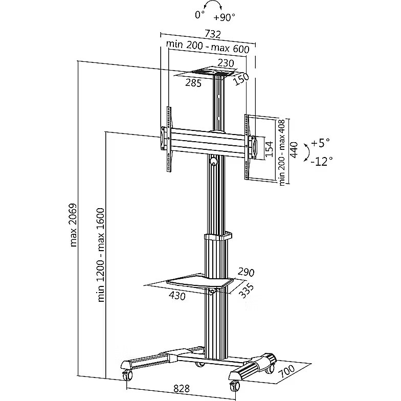 Other features - With four lockable heavy duty castors Material: Steel, plastic, aluminum Mounting type: freestanding Continuously height adjustable : 12001600 mm Height adjustment: manual Tilt: -12°/+5°, front panel rotatable: 90°