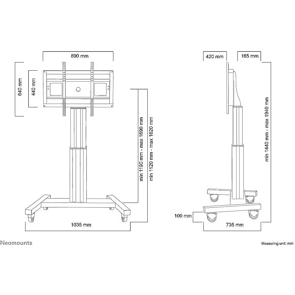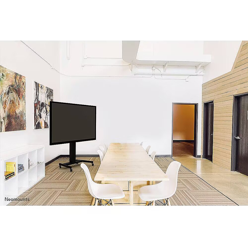 LongDesc - With the Neomounts PLASMA-M2500BLACK automatic height adjustable floor stand you place a large format flat screen on the floor. Get optimal positioning for both standing and seated audiences, in any application, in any part of your location. Perfect to use in a class room, boardroom, presentation room or public entrance.The PLASMA-M2500BLACK is suited for screens between 42-100" and has a load capacity of 150 kg. The trolley is suitable for screens with a VESA hole pattern of 300x200 to 600x800 mm. Behind the screen is a 6 cm deep space available to mount a media player or mini-computer. Cables can be guided at the back of the mount.Easily roll this cart over doorways and thresholds with to the high quality wheels. The mobile electric floor lift is automatically height adjustable over a height of 50 cm with a remote control. From the floor to the center the distance of the screen is variable from 111 to 161 cm. The trolley features four solid castor wheels, of which the two front wheels are equipped with a brake.The Neomounts PLASMA-M2500BLACK comes in a black RAL 9005 color and is a great choice for space saving placement or when wall-, ceiling mounting or desk placement is not an option. All installation material is included with the product.