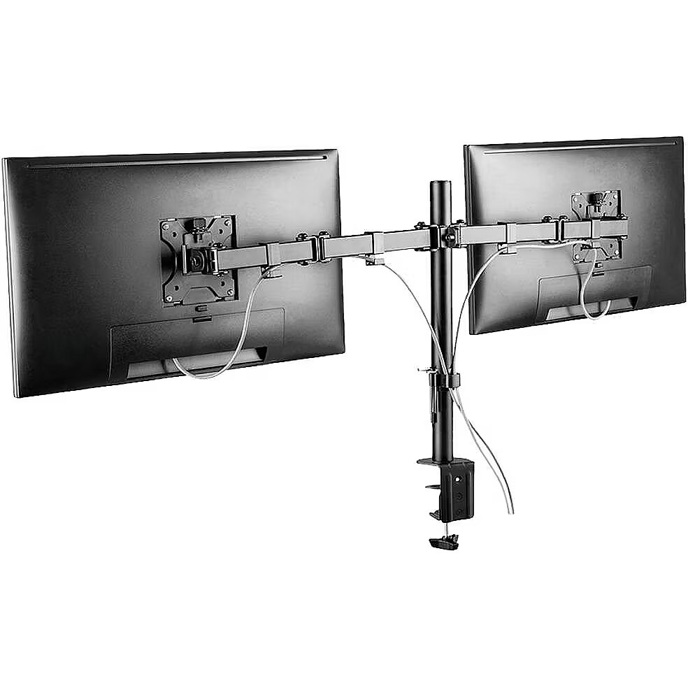 LongDesc - The Neomounts desk mount, model FPMA-D550DBLACK is a tilt-, swivel and rotatable desk mount for 2 flat screens up to 32". This mount is a great choice for space saving placement on desks using a desk clamp or grommet mount.Neomounts versatile tilt (90°), rotate (360°) and swivel (180°) technology allows the mount to change to any viewing angle to fully benefit from the capabilities of the flat screen. The mount is manually height adjustable from 0 to 44 centimetres. Depth adjustable from 4 to 46 centimetres. An innovative cable management conceals and routes cables from mount to flat screen. Hide your cables to keep the workplace nice and tidy.Neomounts FPMA-D550DBLACK has three pivot points and is suitable for screens up to 32". The weight capacity of this product is 8 kg each screen. The desk mount is suitable for screens that meet VESA hole pattern 75x75 or 100x100mm. Different hole patterns can be covered using Neomounts VESA adapter plates.By using an ergonomic mount neck- and back complaints can be avoided. Ideal for use in offices and on counters or in a reception area.All installation material is included with the product.