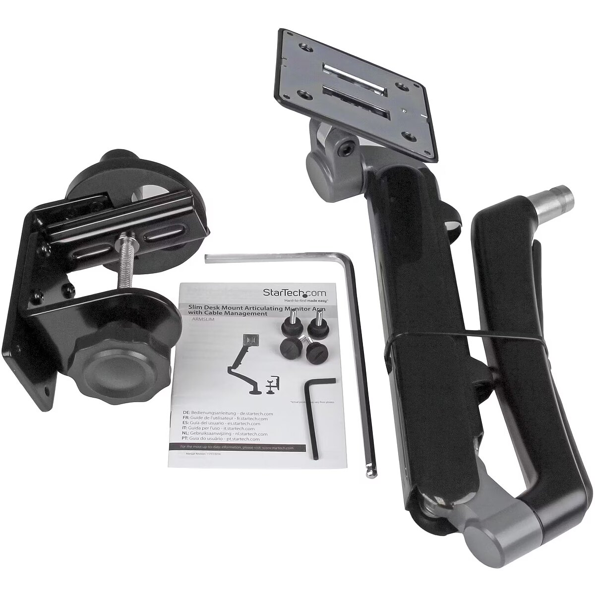 LongDesc - VESA Monitor Mount | Desk/Grommet Mount | Slim Profile | For up to 34" MonitorsThis slim, articulating desk-mount monitor arm lets you mount a flat-panel display to free up space on your desk or table. The full motion articulating arm make it easy to position your monitor for the perfect viewing angle and optimal comfort.Reclaim your Desk Space and Work in ComfortWith a stylish, slim design that looks great and takes up only a small amount of desk space, the single monitor arm lets you locate your display as needed while reclaiming valuable workspace. The monitor mount supports 12" to 34" displays with a maximum weight capacity of 15 lb. (7 kg). Mounting your display above the desk surface enables you to adjust your display height, position and viewing angles easily, for an ergonomic work environment.Full-Motion and Spring-Assisted Height AdjustmentThe full motion mount lets you extend the arm a full 23.46" (596 mm). Position your monitor for ideal viewing with the articulating monitor arm. You can tilt and swivel your display with a full range of motion across multiple axes. The spring-assisted height adjustment lets you raise or lower your monitor with smooth and effortless positioning. For viewing longer pages or blocks of code without having to scroll down your screen, the adjustable monitor arm also supports landscape-to-portrait display rotation.Steel Construction and Easy SetupWith its durable steel construction, the display mount securely holds your computer monitor. Setting up is easy. You can either clamp the mount to the side of your desk or table, or mount it through a grommet hole (hardware included). The adjustable arm features a helpful indicator area to help configure the desired level of resistance for moving the display. The integrated cable management channel keeps things neat and organized.The TAA compliant ARMSLIM monitor arm is backed by a StarTech.com 10-year warranty and free, lifetime technical support.The StarTech.com Advantage