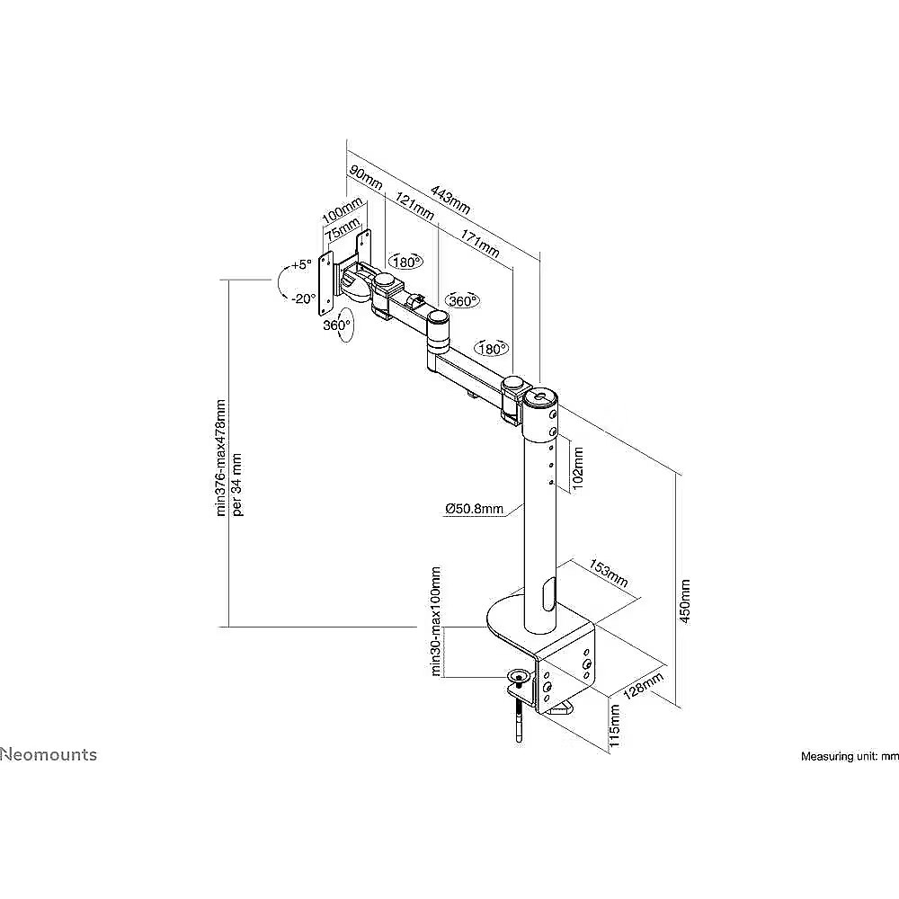 LongSummaryDescription - Neomounts FPMA-D960BLACKPLUS Monitor arm 10-49". Mounting: Clamp, Maximum weight capacity: 20 kg, Minimum screen size: 25.4 cm (10"), Maximum screen size: 124.5 cm (49"), Minimum VESA mount: 75 x 75 mm, Maximum VESA mount: 100 x 100 mm. Height adjustment, Swivel angle range: 0 - 180°, Tilt angle range: 0 - 25°. Product colour: Black