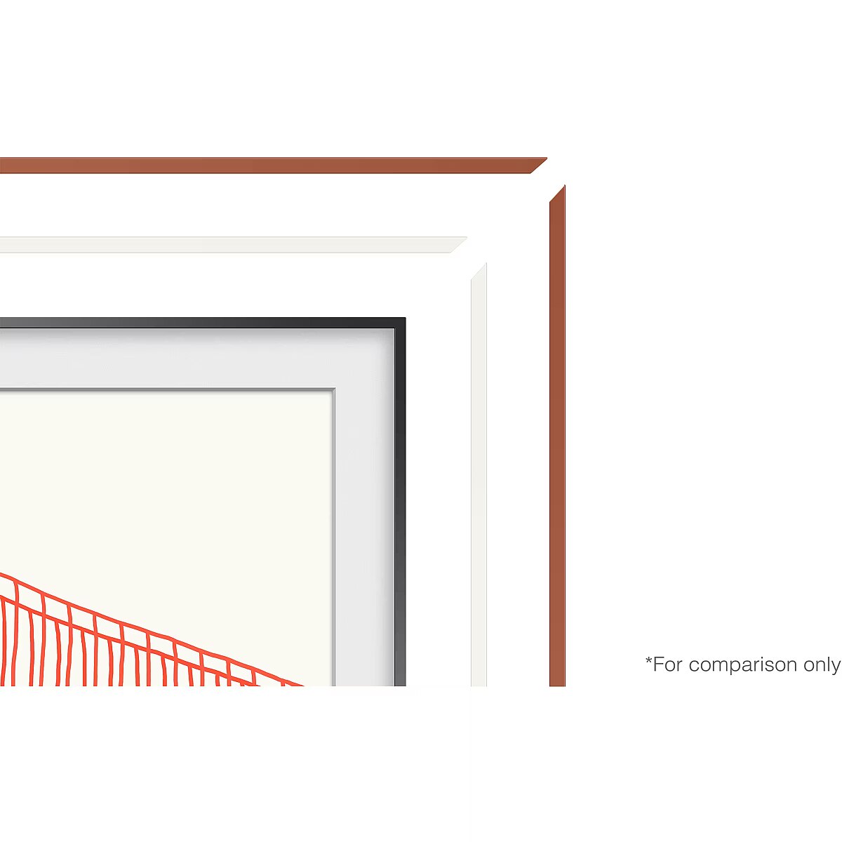 LongDesc - More colors, more styles, more you.Express your style — even with your TV. An expanded range of bezel color and style options means you can create the right look to reflect your space.Choose your colorSelect from four colors: White, Teak, Brown or Brick Red. Whether you want The Frame to blend in with your decor or you want it to make a statement, there's a perfect combination for everyone.Customize the stylePick from two different bezel design types. Choose Modern to complement your home's contemporary vibe or select Beveled for a more traditional appearance.Get a fresh new look in a snapSwapping out the bezel color is a breeze — The Frame’s interchangeable bezels are magnetic so you can customize them at your whim.Find the right bezel for your Frame TV based on sizeModern bezels are compatible with 43-75" 2021 The Frame TVs. Beveled bezels are compatible with 65" and 55" 2021 The Frame TVs.