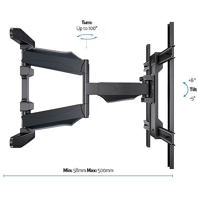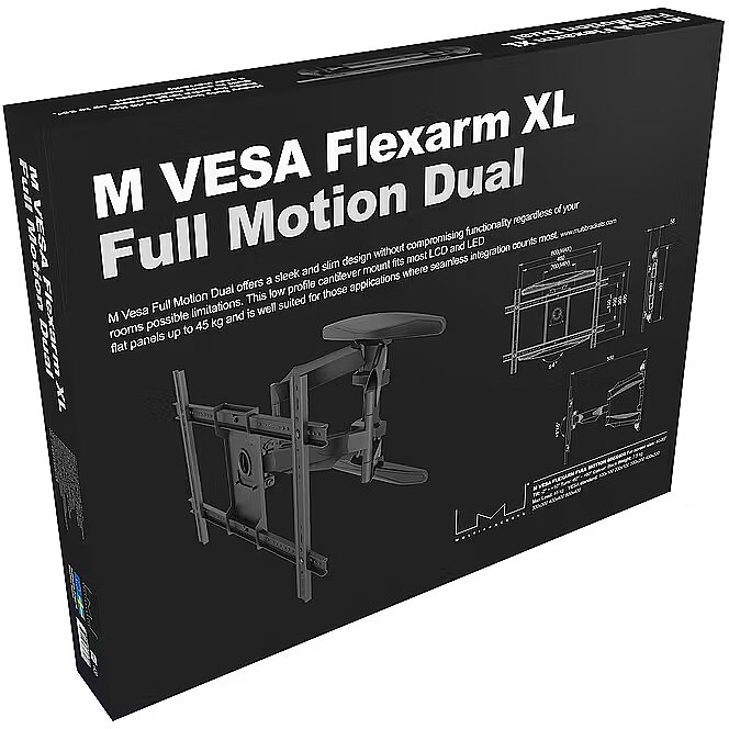 LongDesc - M VESA Flexarm XL Full Motion Dual ends an era of bulky and heavy arms needed to flex, tilt and turn. If your aim is to find a discreet partner for that new LED, LCD or plasma in a light weight, super strong solution not visible from any side yet giving you a maximum flexibility then the M VESA Flexarm Full Motion Dual is your choice.The uniquely designed low profile M VESA Flexarm XL Full Motion Dual mount fits most 40" and up to 85" flat panels up to 45 kg. It is very well-suited for those applications where seamless integration counts the most. The M VESA Flexarm XL Full Motion Dual is part of the Slim Series of fixed, tilt and cantilever mounts offering a slim design without compromising on functionality. Moreover, this wallmount has an extended profile of 500 mm from the wall.The specifications this product reveals are simply incredible.Super Slim defines the minimal 46 mm of the low profile to wall. It extends to a maximum of 500 mm proving that this construction is truly flexible being so lightweight. Yet still, produced with high quality materials creating a super strong solution carrying screen up to 45 kgs.Being both slim and flexible the built in functions of the wall mount allows you to optimize the screen for the perfect viewing angle. Wherever you are.M VESA Flexarm Full Motion Dual is suitable for a wide range of screens sized 40" and up to 85". The VESA standards that are supported by this mount is 200 / 300/ 400 and up to 600mm. This means that M VESA Flexarm Full Motion Dual is suitable for most of the VESA standards including the rare ones.